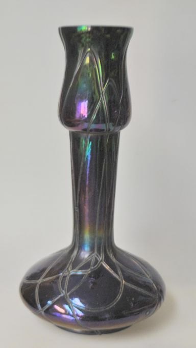 Loetz vase, jugendstil, ca. 1900. Af irriseret glas med forløb af stegdekorationer af glas. H.: 29 cm.