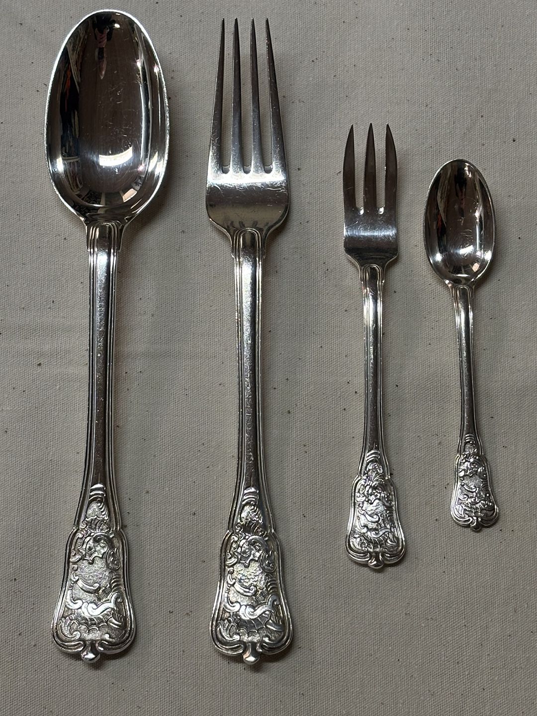 spiseske 700,-spisegaffel 700,-Kagegaffel 300,- kaffeske 200,- Flot stand.