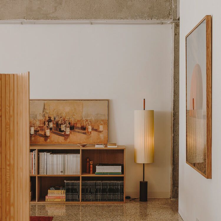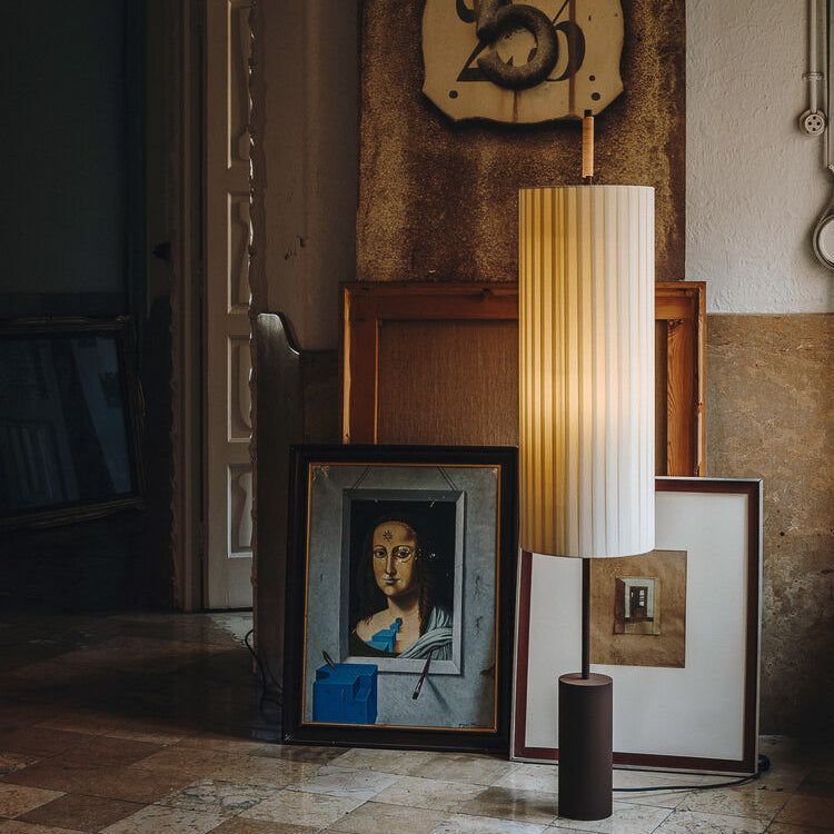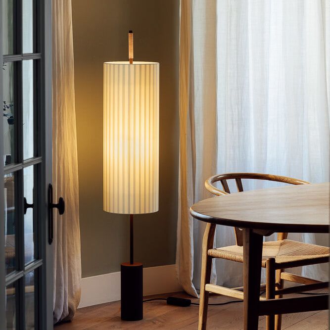 Dorica gulvlampe m. natur bogbinderbånd og metalstruktur. Dæmpbar. Designet i 1994.