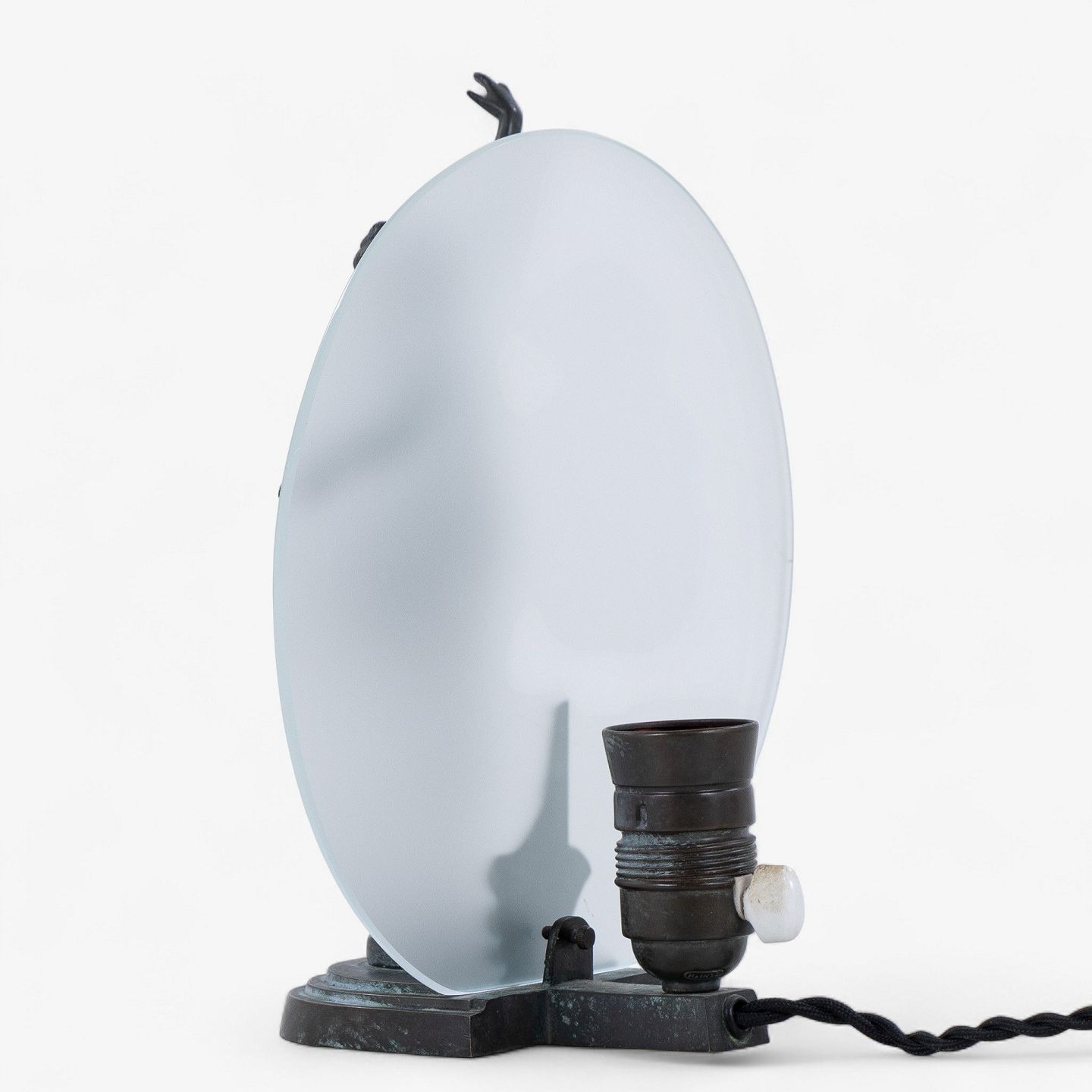 Bordlampe med dansende kvinde i patineret bronze og glasskærm.