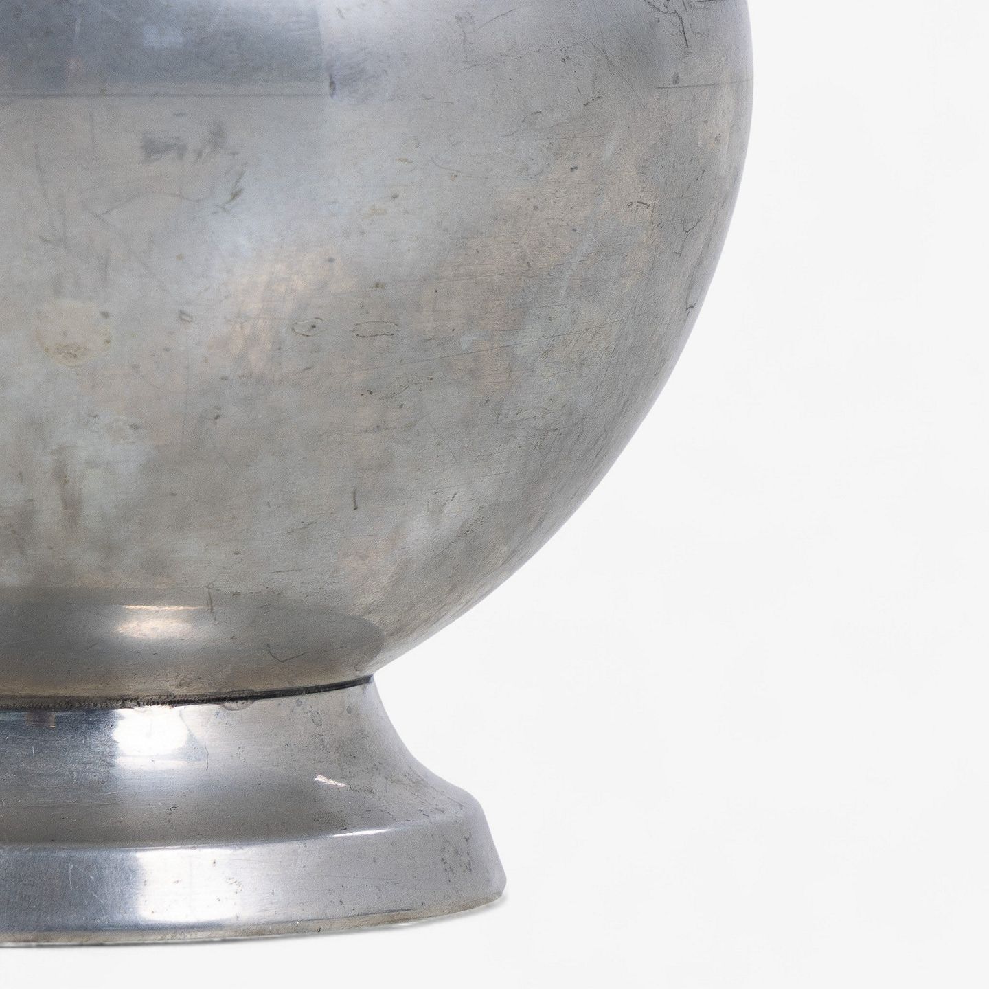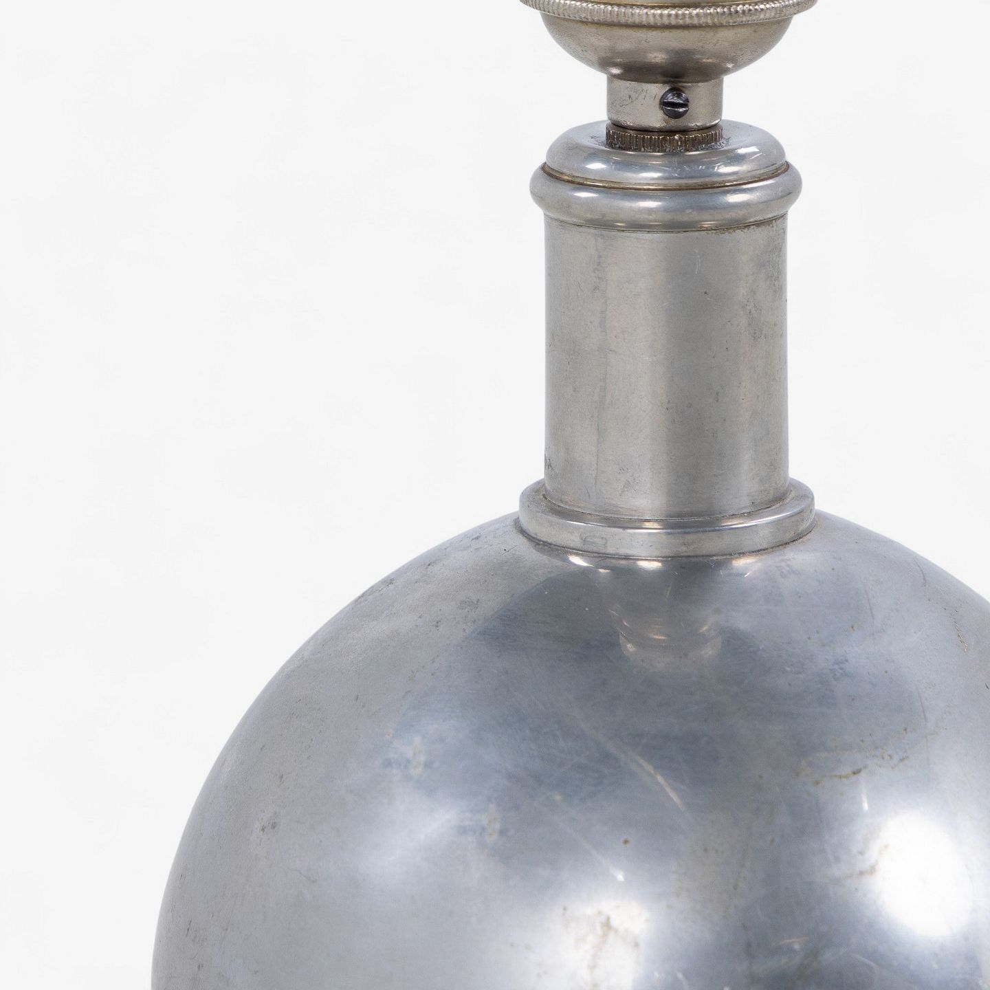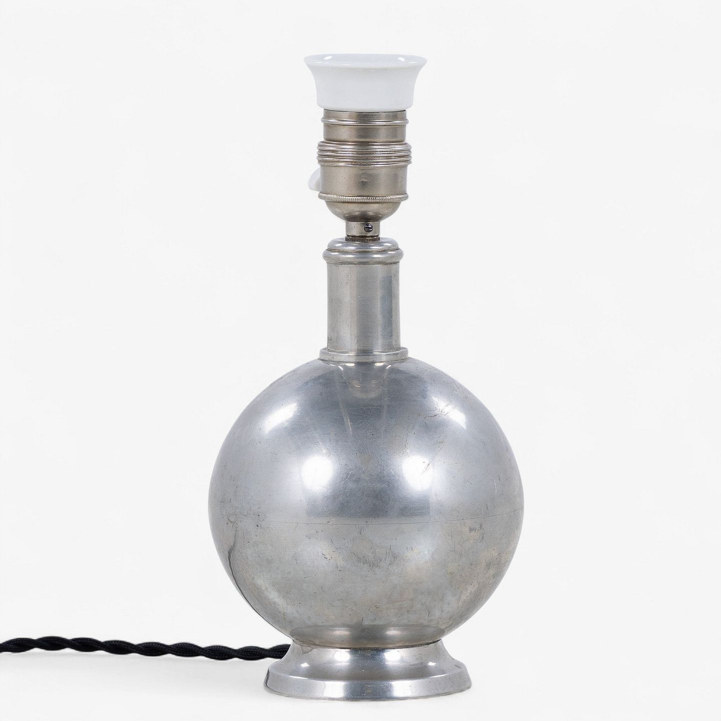Kugleformet bordlampe i patineret tin uden skærm.