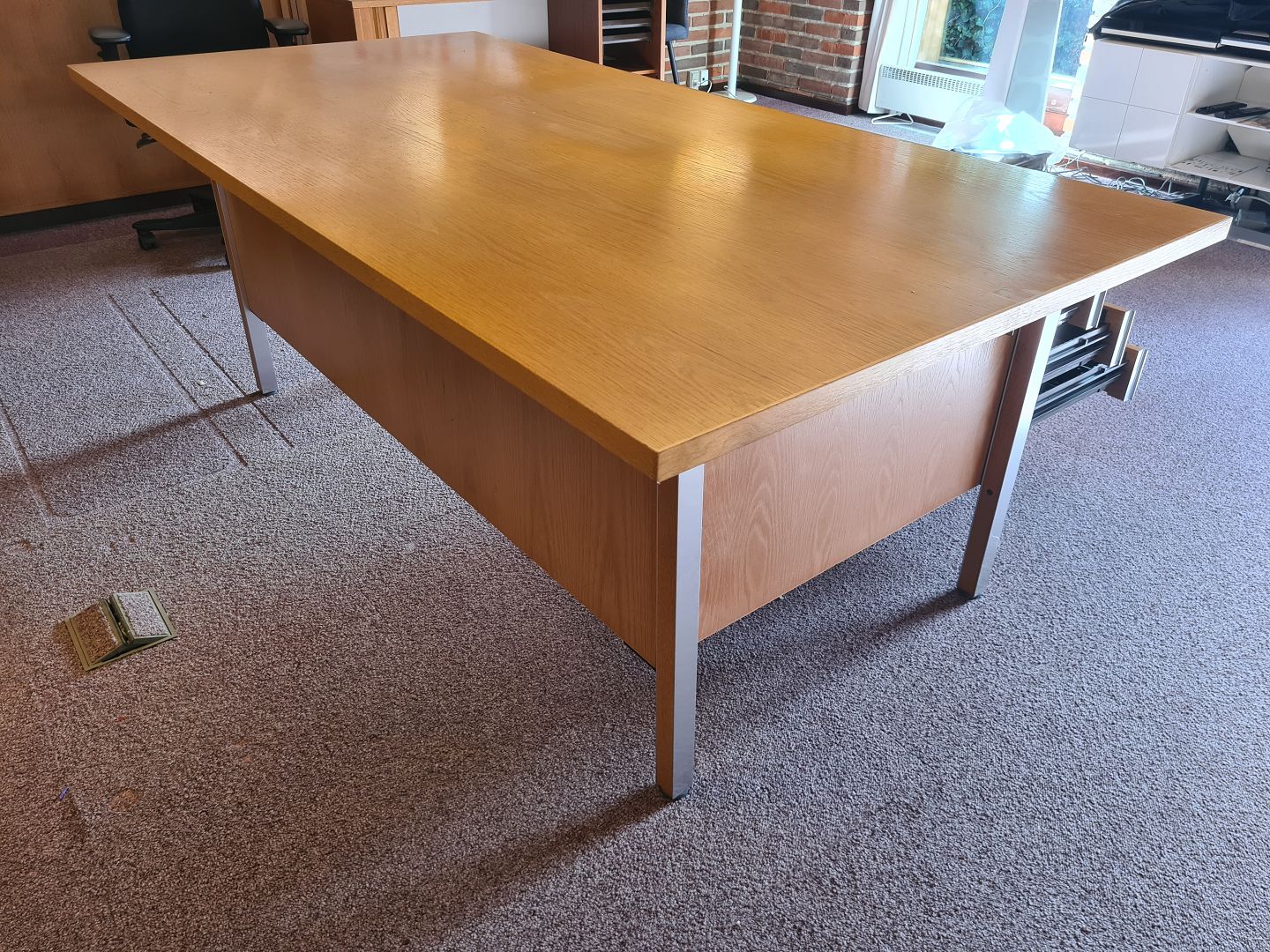 Stort Skrivebord fra 1980'erne i eg og aluminium. Fremstår pænt, velholdt og udmærket funktionsdygtigt. Dog med meget let afblegning på bordpladen efter en skrivemåtte. (Ses på billede)