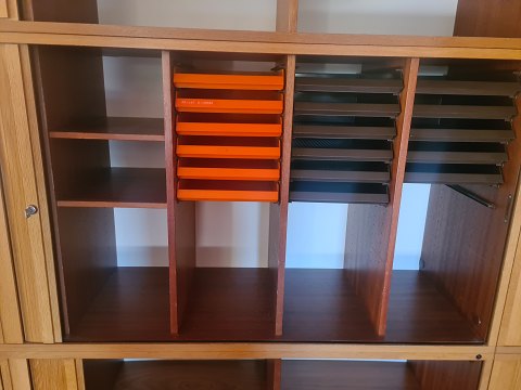 Arkivskab fra 1980'erne i finéret eg med jalousi låge. Fremstår pænt og velholdt, dog med lettere brugsspor på toppen. (Billeder) Forskellige indretningsformer haves. (Billeder) Fungerende nøgle medfølger.