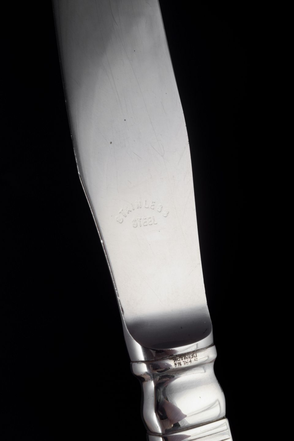 Set of 4 dinner knives in the elegant “Acadia / Blok” pattern, designed by Harald Nielsen in 1918. The knives feature sterling silver handles combined with long stainless steel blades. A classic example of Art Deco style, with functionalist lines and geometric proportions.