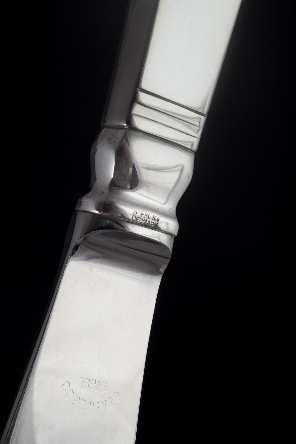 “Acadia” (Danish “Blok”) was introduced in 1918 and is one of Harald Nielsen’s most significant contributions to Georg Jensen’s flatware range. With its streamlined functionalist design and Art Deco character, it stands out as one of the earliest examples of modernist influence in Danish silver design.