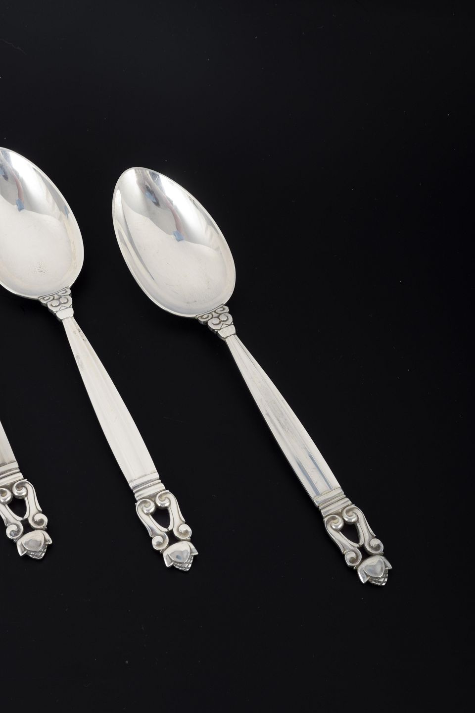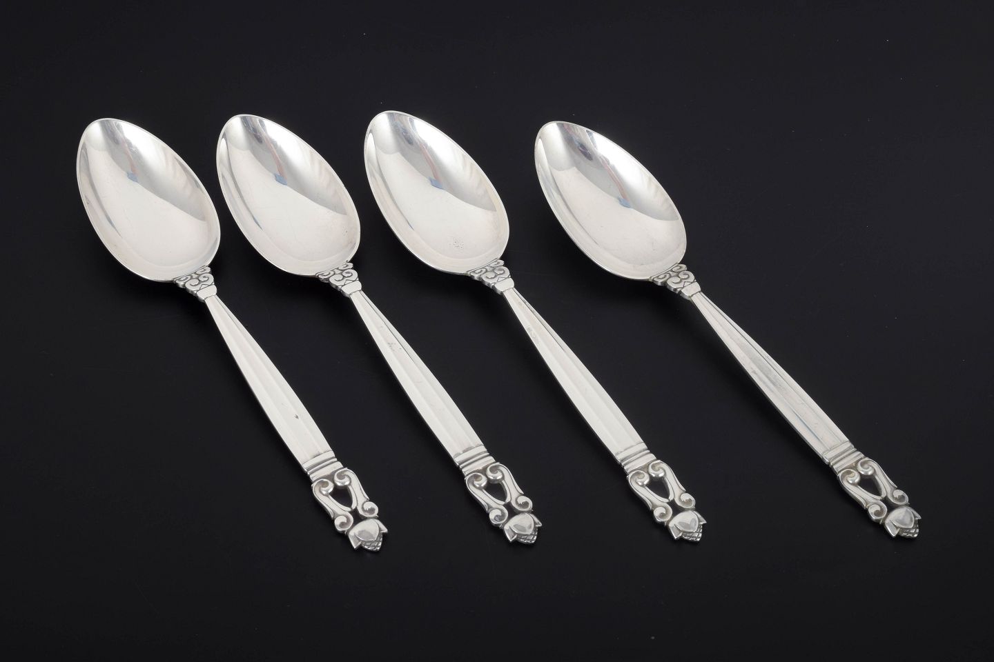 Set of 4 soup spoons in the classic “Acorn / Konge” pattern, designed by Johan Rohde in 1915. Elegantly crafted with handles decorated with the characteristic acanthus leaf and acorn motif.