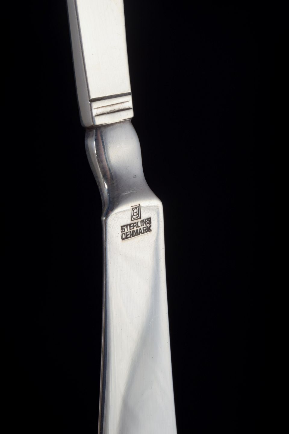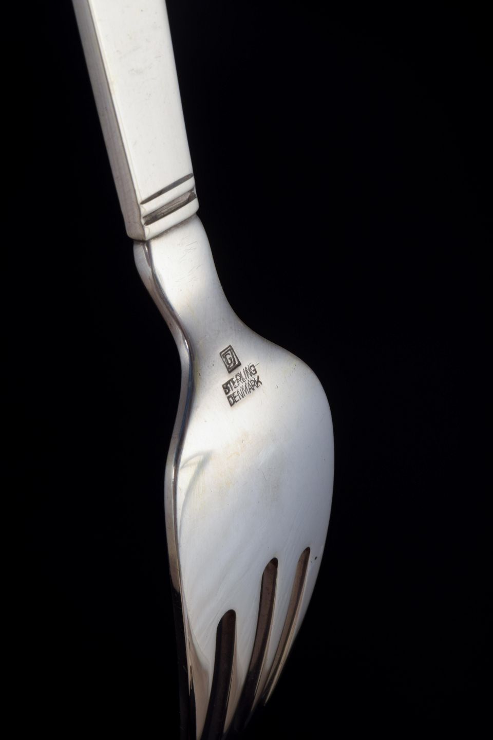 Sæt bestående af 8 dele fiskebestik til 4 personer i det elegante “Blok / Acadia”-mønster, designet af Harald Nielsen i 1918. Hver kuvert består af en fiskekniv og en fiskegaffel. Mønstret er karakteriseret ved en stram, funktionalistisk formgivning med glatte flader og geometriske proportioner.