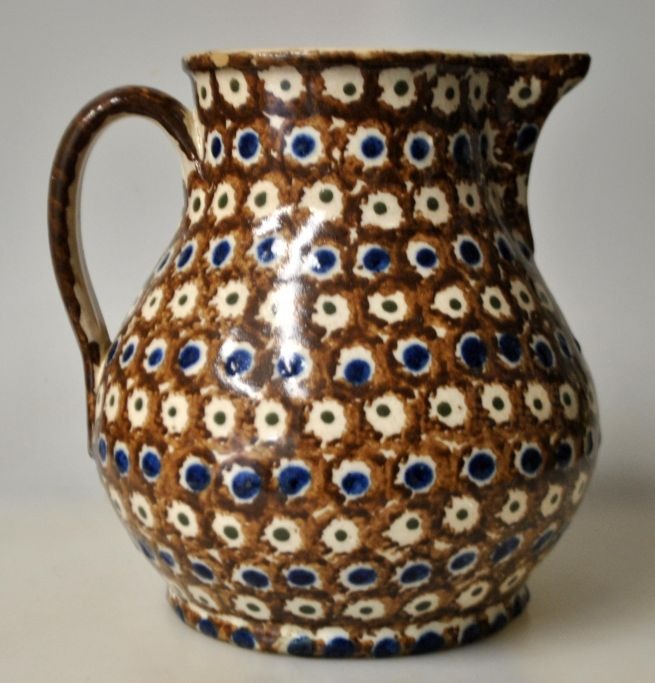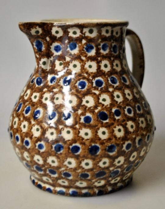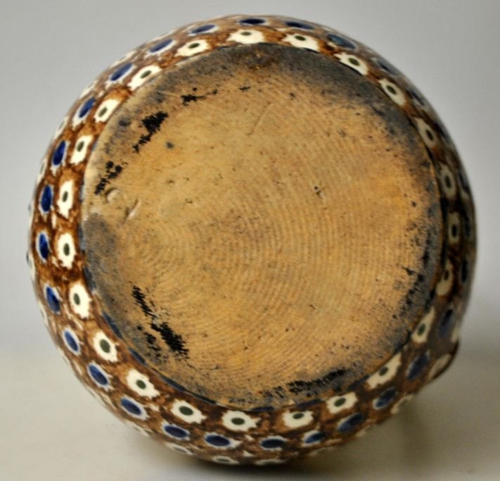 Antik dansk lerkande, 19. årh. Rødler med brune, blå og grønne glasurer. H.: 18 cm.