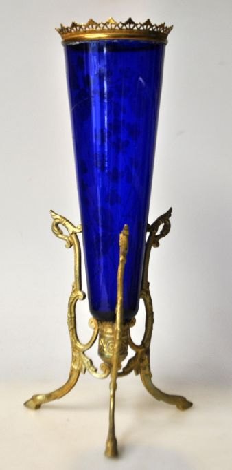 Antik cobolt blå vase med emaljemaleri, 19. årh. Tyskland. Monteret i bronze stativ. H.: 28,5 cm.