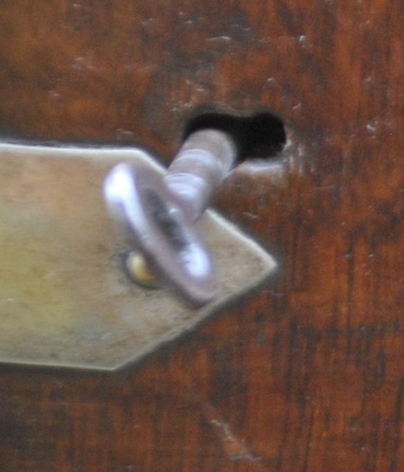 Tantalus af egetræ med to forskellige karafler af krystal med propper. England. 19. årh. Messinghåndtag og -beslag. Sideåbning med lås og nøgle. L: 26 cm. H: 32 cm.