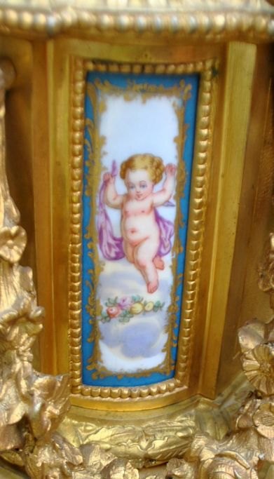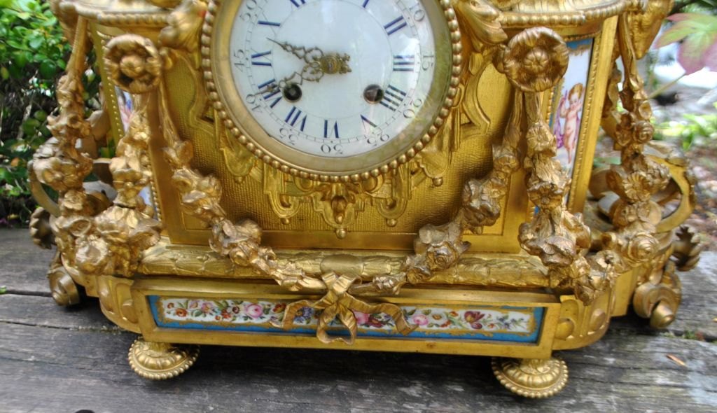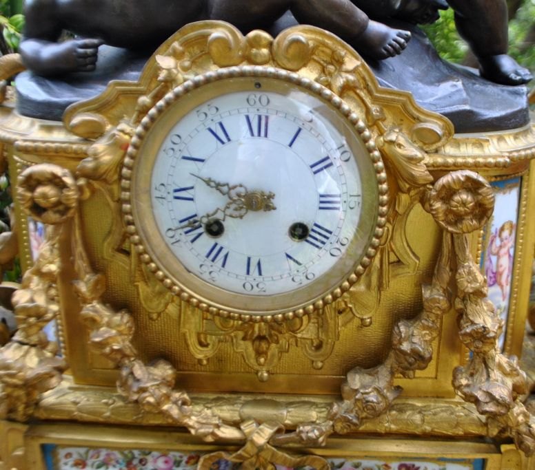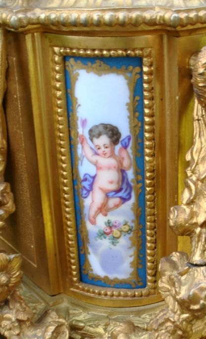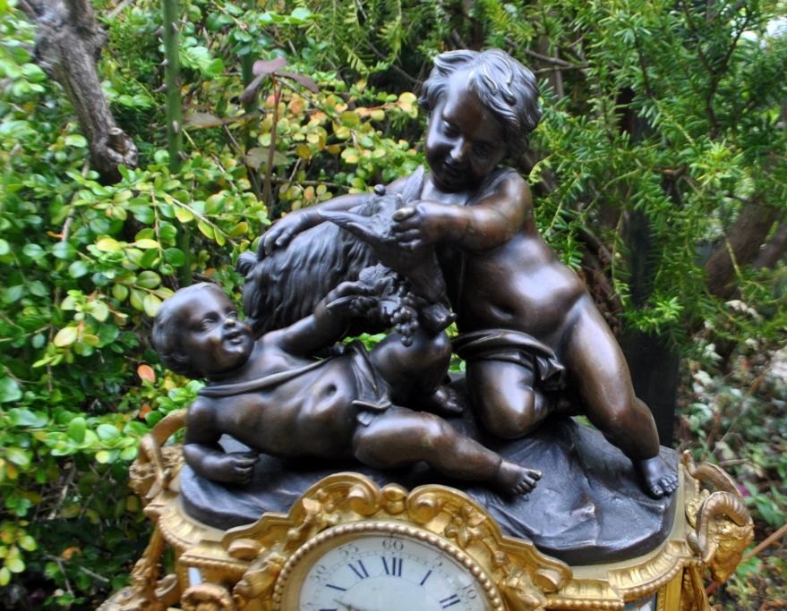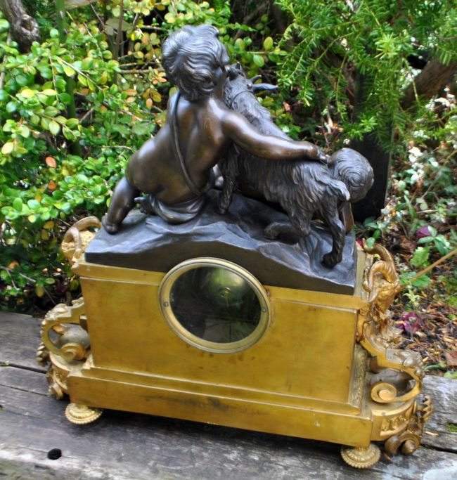 Stort fransk kaminur i bronze, tidlig 19. årh. Topdekoration i form af to putti og en gedebuk. Urhus i lueforgyldt bronze med guirlander og vædderhoveder. Ligeledes porcelæns plaquetter med blomster og putti. Urskive i hvidt emalje med romertal og arabertal. Standart urværk med snorophæng.