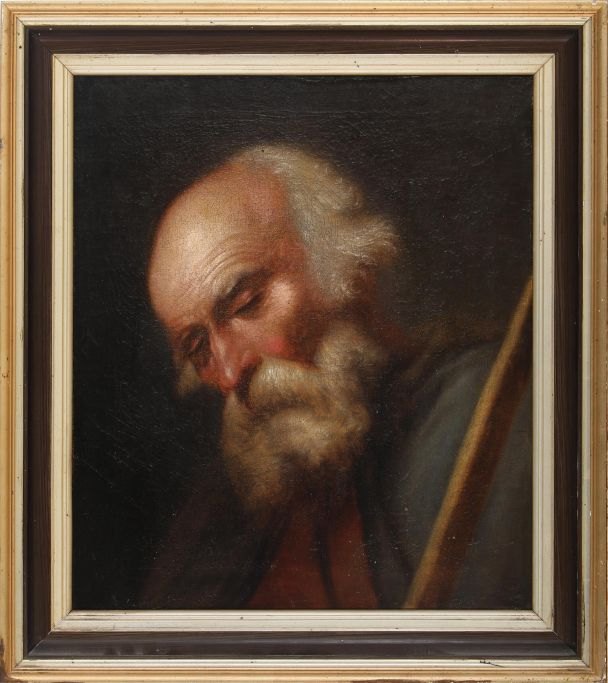Ubekendt kunstner ca. 1700: Studie af Apostlen Sankt Peter. Portræt. Olie på lærred. Utydelig signeret på bagsiden. 50 x 43 cm.