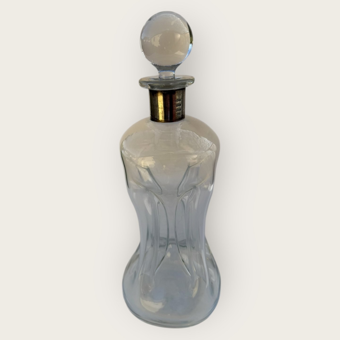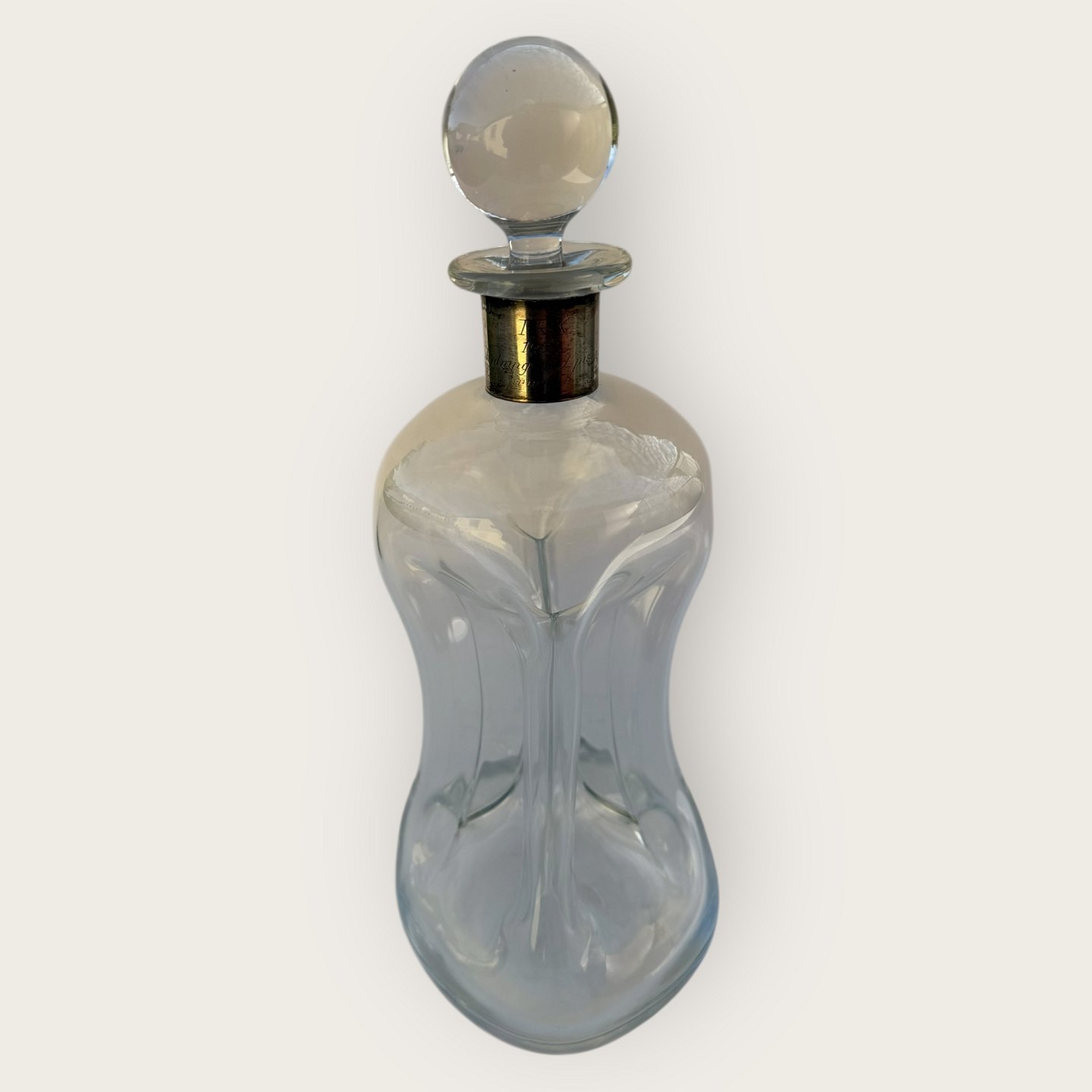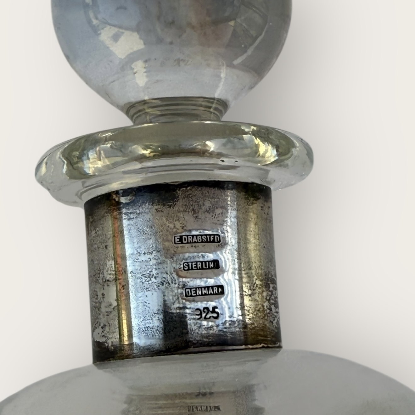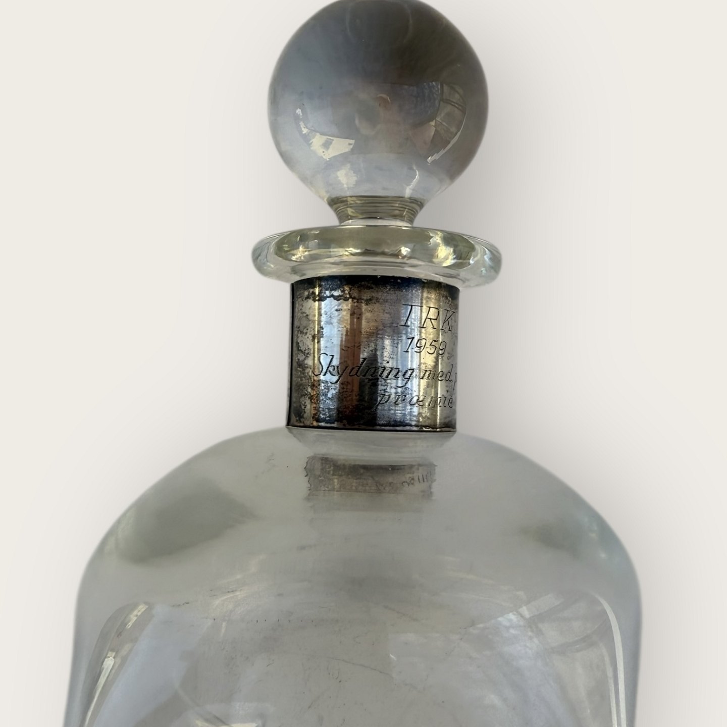 Stor klukflaske med sterling sølvmontering fra E. Dragsted, indgraveret: Præmie skydning med Pistol 1959, Højde 32cm *fin stand*