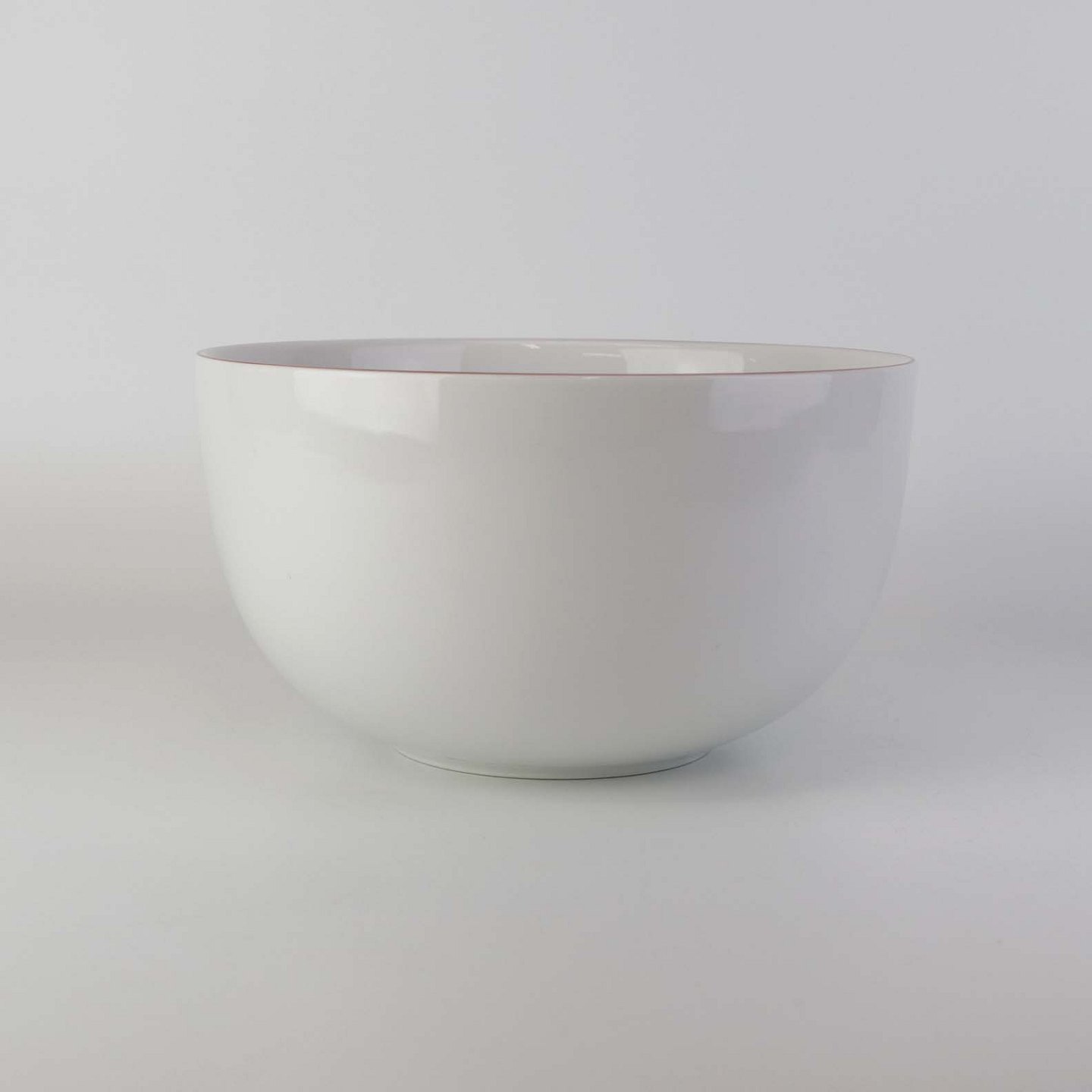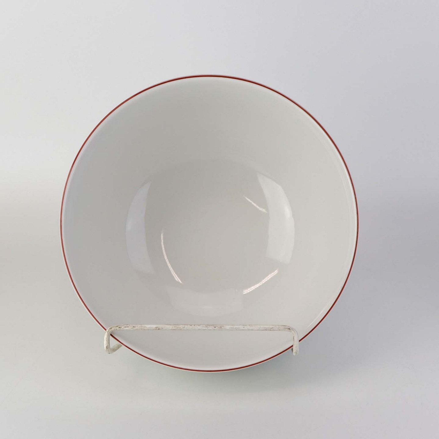 Service i glat hvidt porcelæn med dekoration i tynd rød streg.