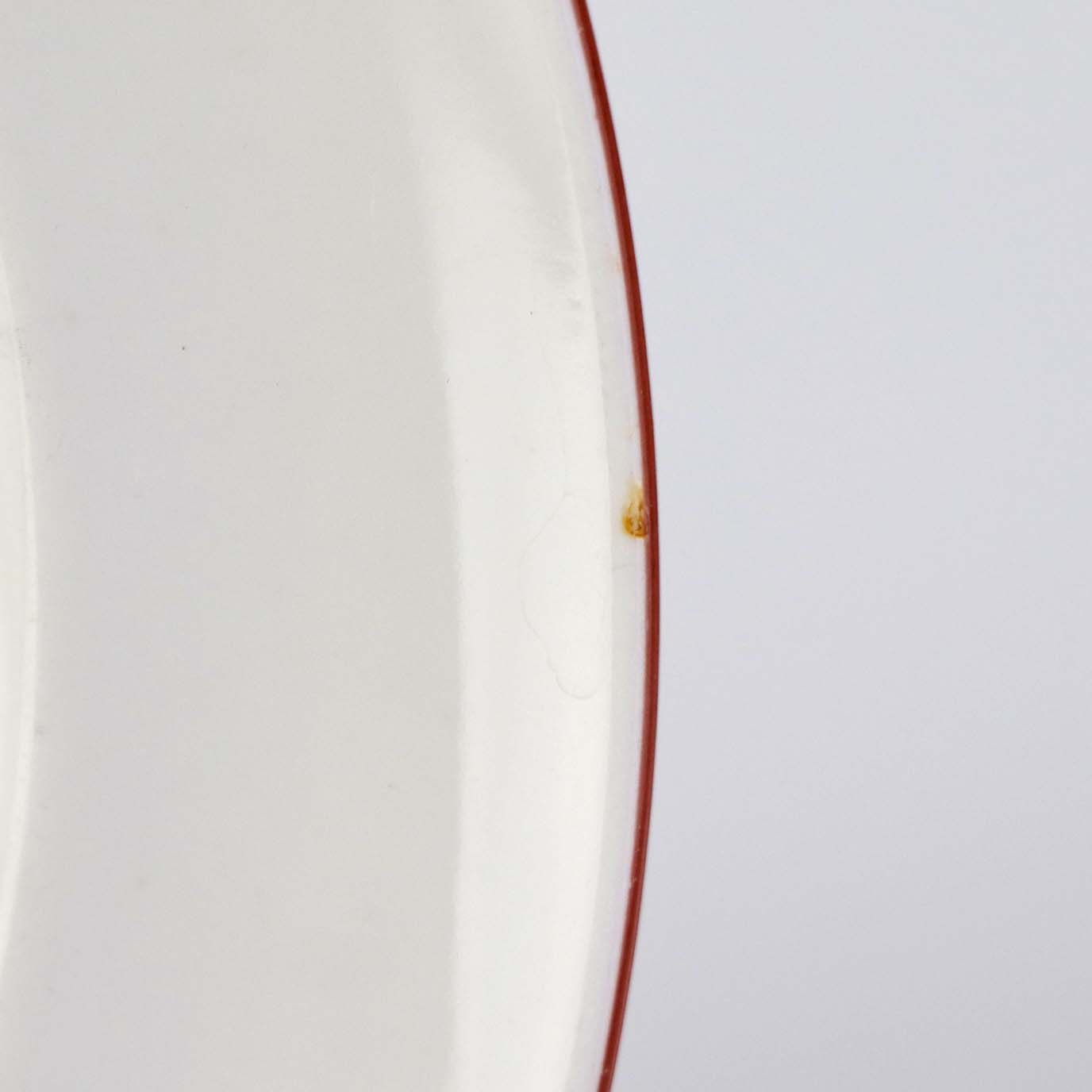 Service i glat hvidt porcelæn med dekoration i tynd rød streg.