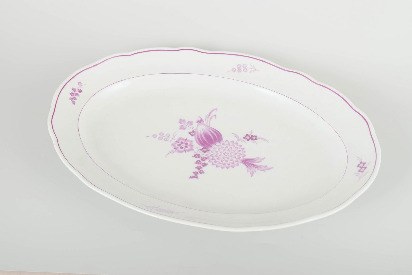 Stort håndmalet ovalt serveringsfad i porcelæn med dekor i lilla blomsterkompositioner og let bølget kant. Klassisk Meissen-design med elegant rosa staffering, ideelt til servering eller som dekorativt midtpunkt.