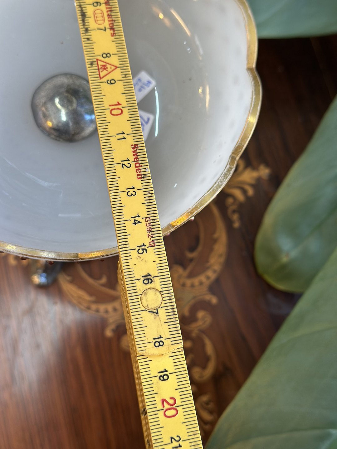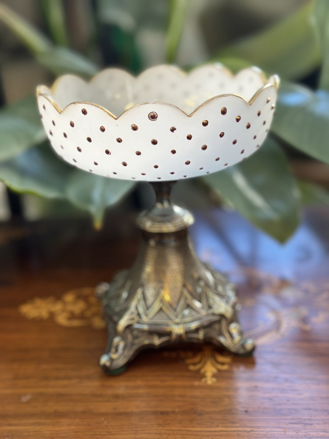 Vintage-Schale aus den 1800er-1900er Jahren, die Schale ist aus Opalglas (milchig weißes Glas) mit handgemalten goldenen Punkten und Goldrand, der Fuß ist versilbert mit dekorativen Jugendstil- und Barock-inspirierten Details, entworfenes Opalglas aus den