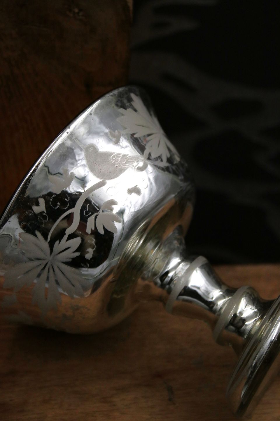 1800 tals skål på fod i fattigmandssølv / Mercury Glass med fugle og bladranke dekorationer på siden...