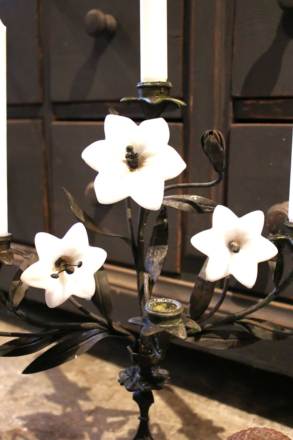 Antik , fransk lysestage i mørk patineret bronze , til 4 stearinlys og dekoreret med 3 gamle hvide glas blomster.