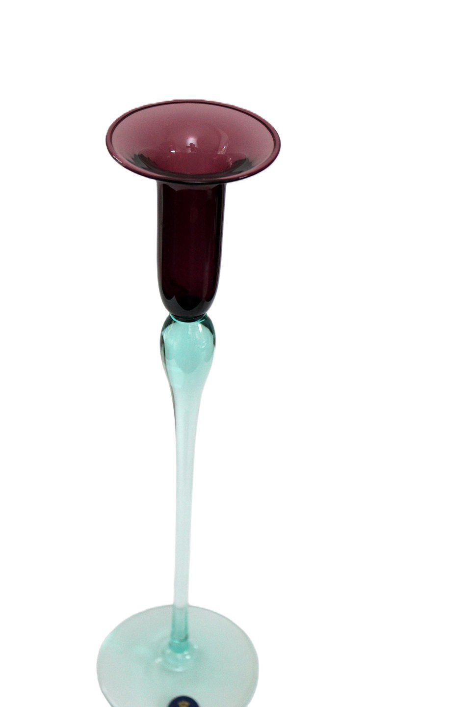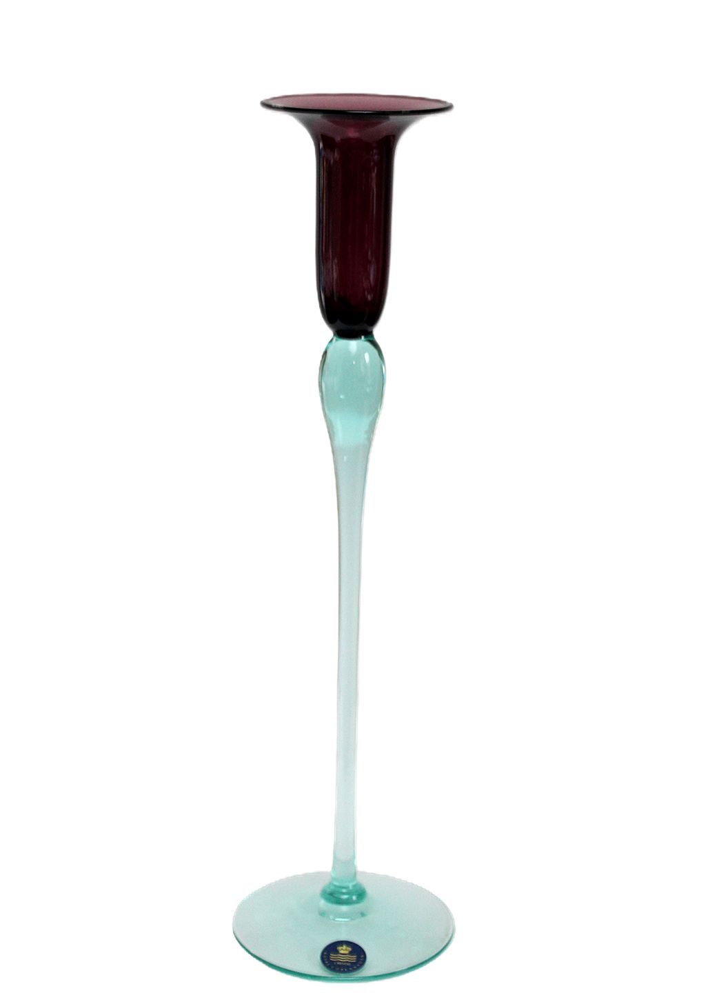 Holmegaard, Harlekin, Lysestage i vinrød/aubergine med aquagrøn stilk. Designet af Anja Kjær i 1994 for Royal Copenhagen. Højde 29,5 cm. Pris: 250 kr. stk. Lager: 1