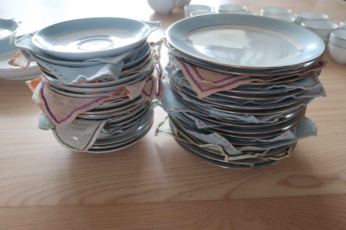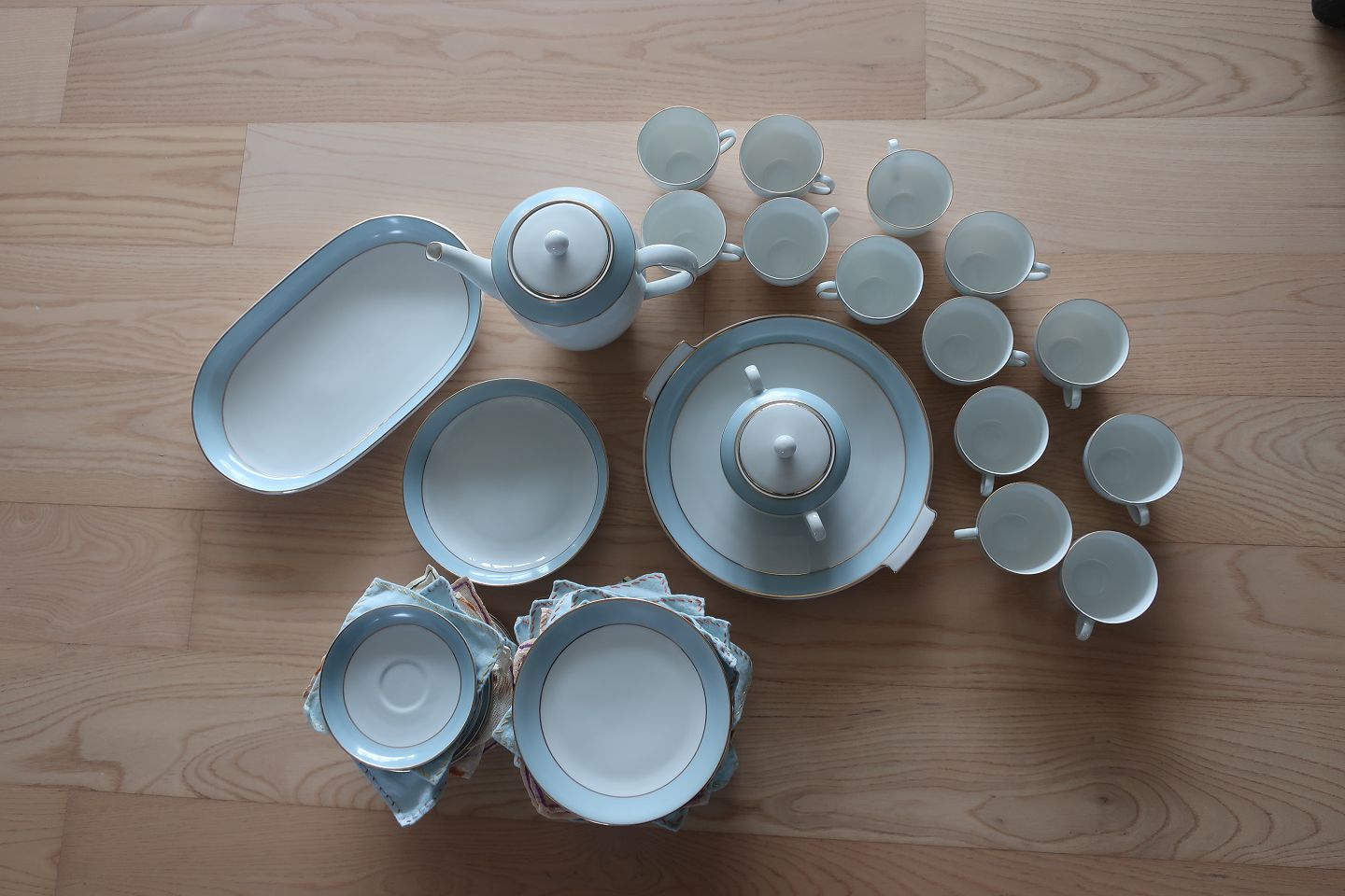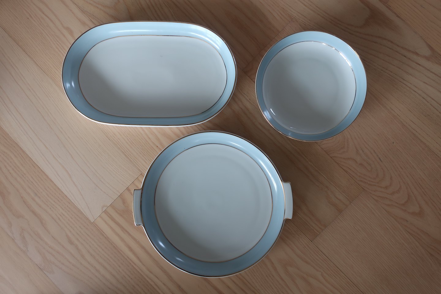 Et dejlig lyst og let stel: Hvidt med bred lys blå kant samt 2 guldstriber