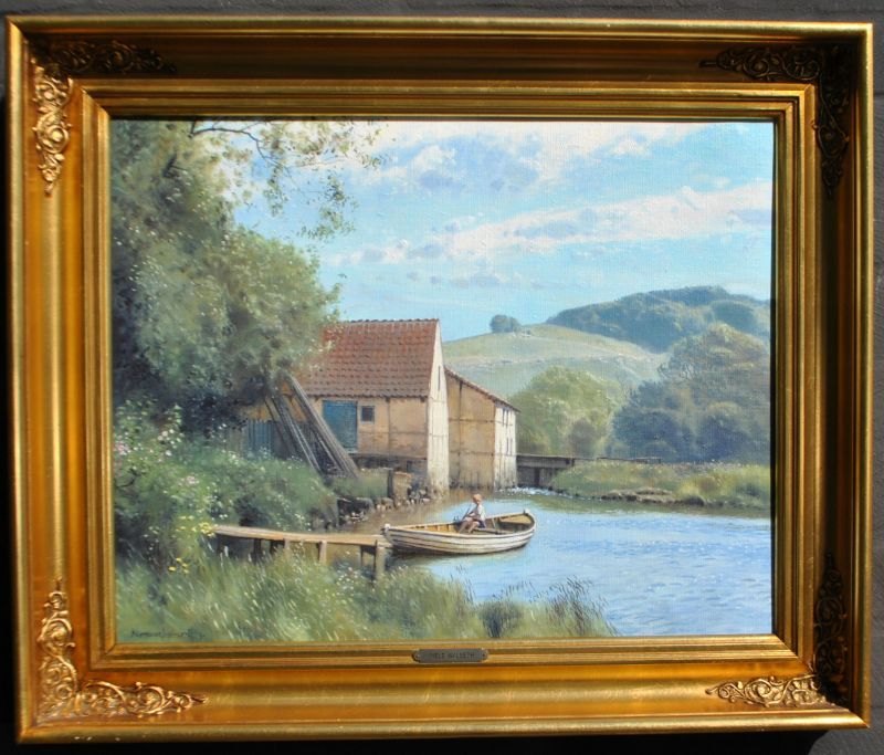 Walseth, Niels (1914 - 2001) Danmark: En dreng i en robåd på en møllesø. Olie på lærred. Signeret. 40 x 50 cm.