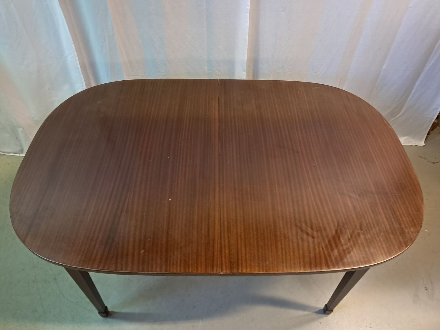Spisebord i fineret mahogni med 2 tillægsplader, fra 1980erne.