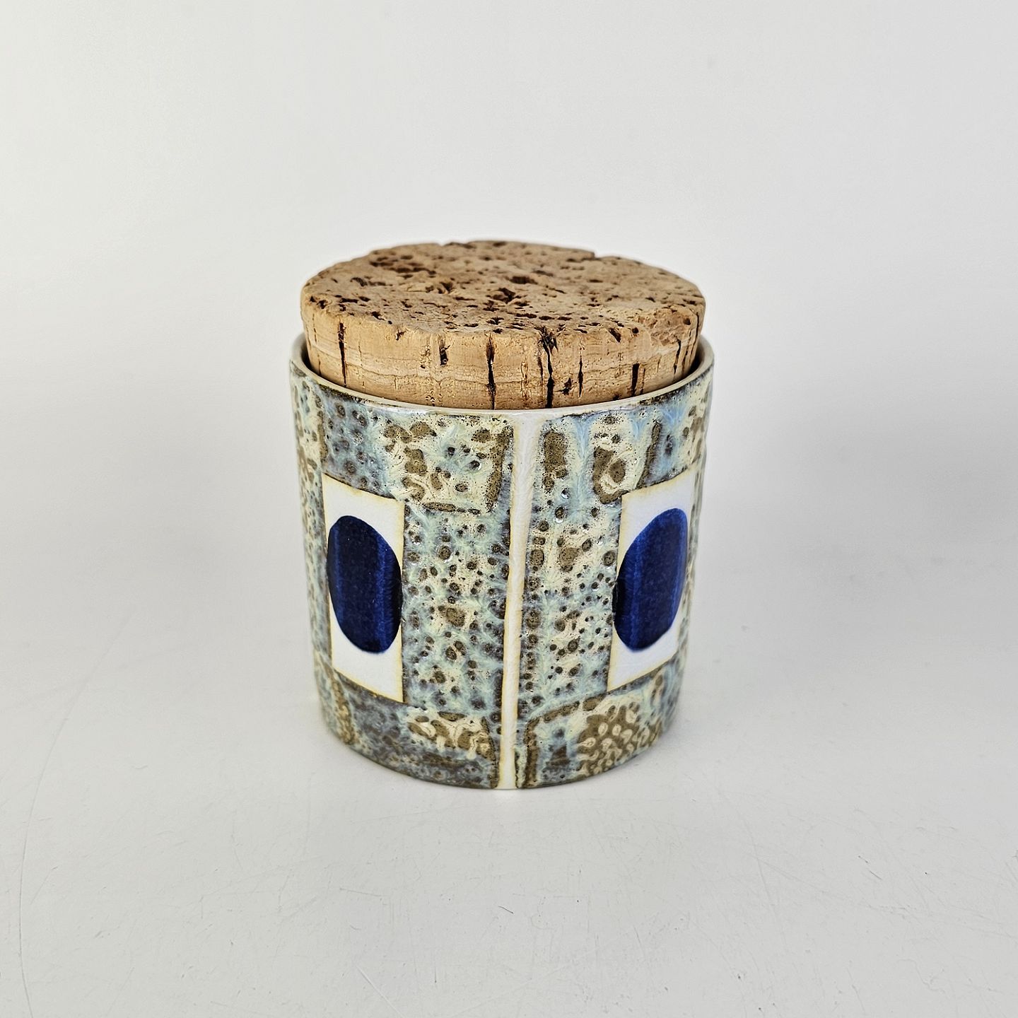 Krukke i fajance med abstrakt mønster i grønne og blå nuancer og korkprop