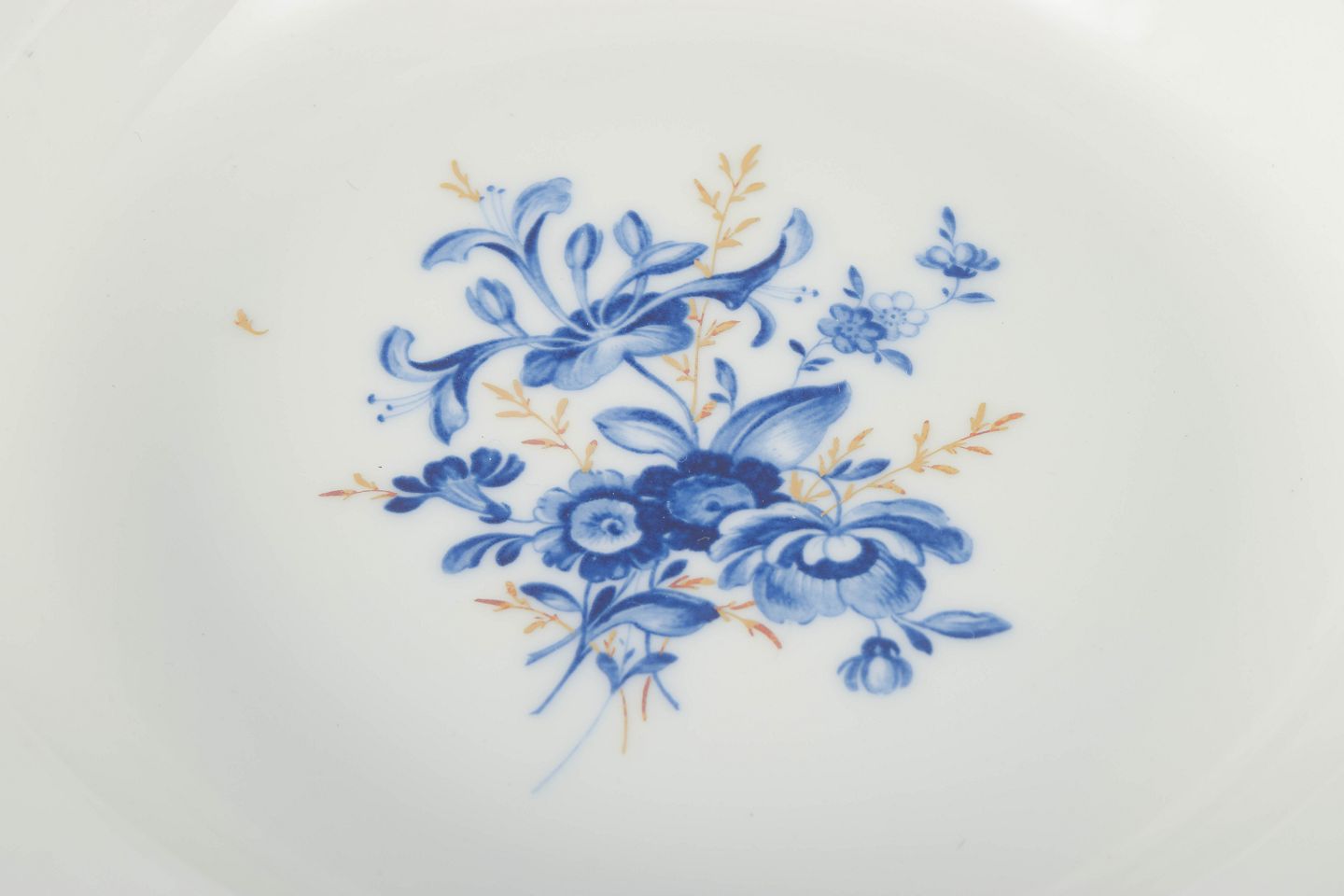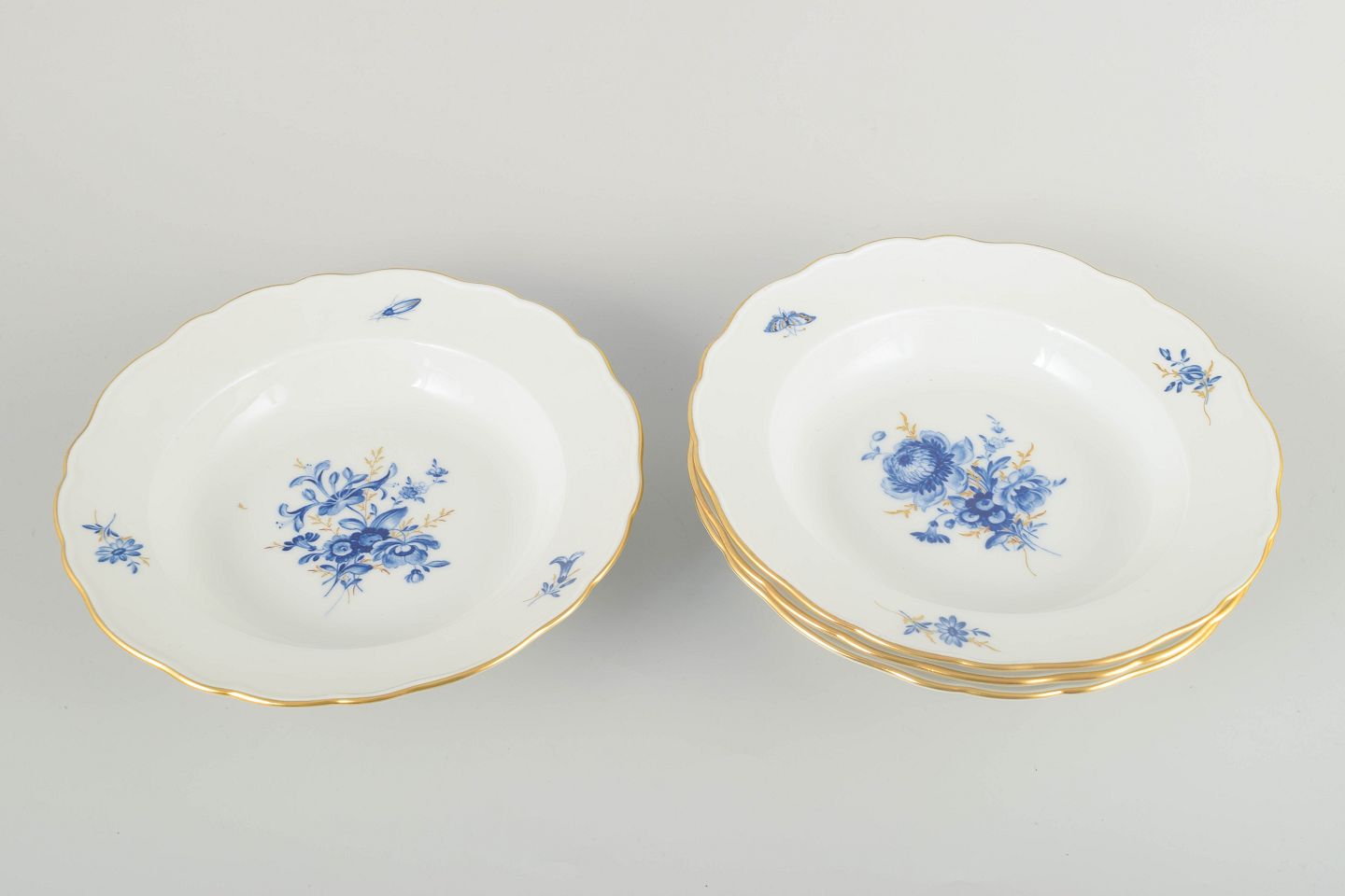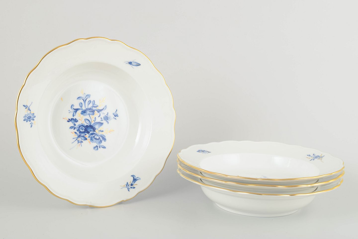 Hånddekoreret porcelæn med håndmalet blå blomsterdekoration og forgyldte stafferinger langs kanten. Klassisk bølget form.