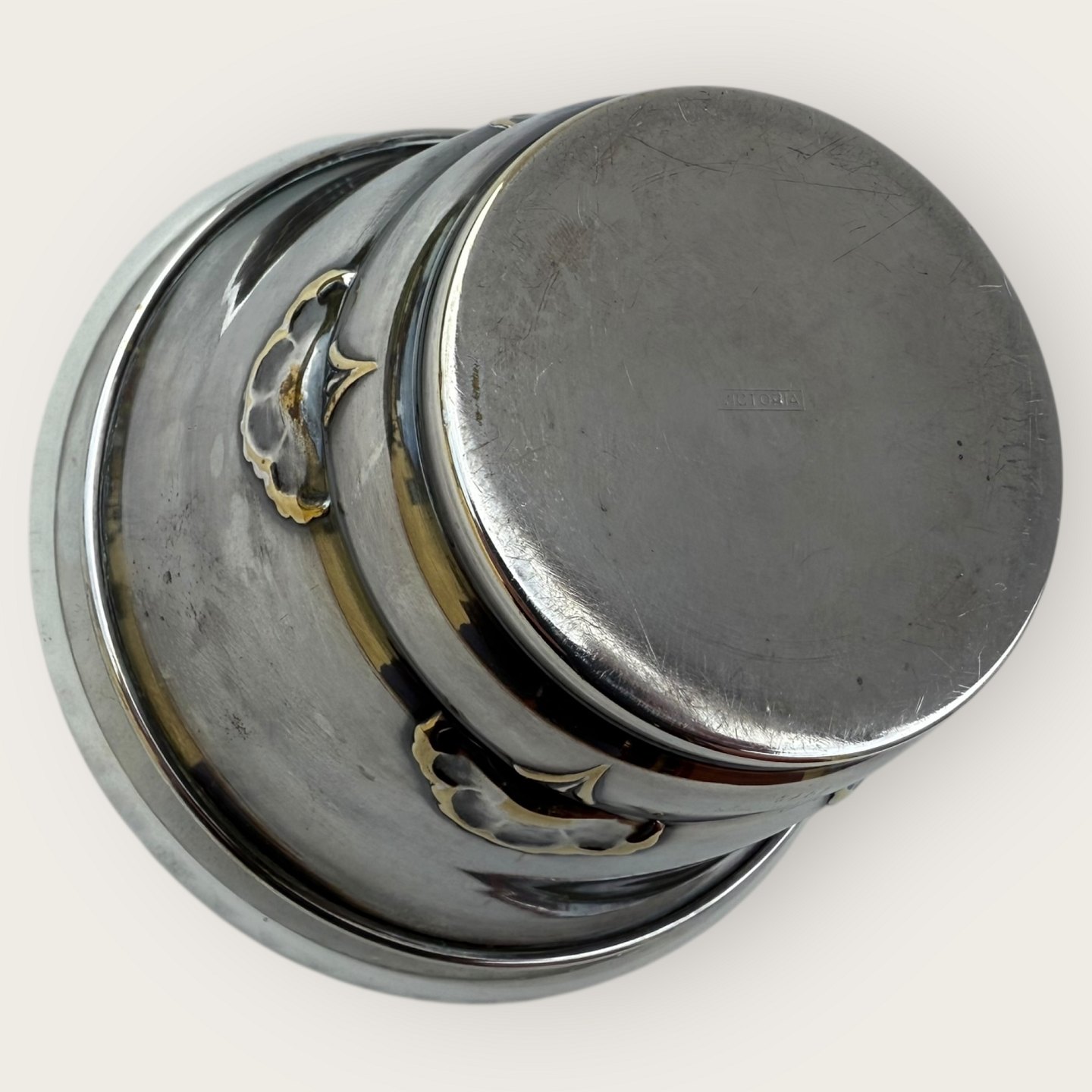 Mindre sølvpletskål med glasindsats, højde 8,5cm, diameter 13,8cm, glasindsatsen i fin stand, sølvpletskålen med patina og indgraveret: Fra gymnasterne i Bjerndrup 1942