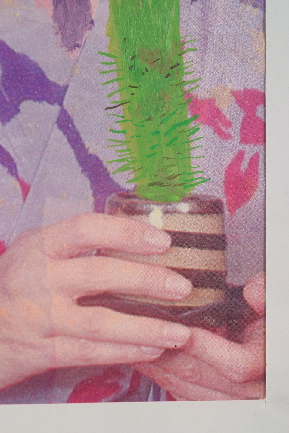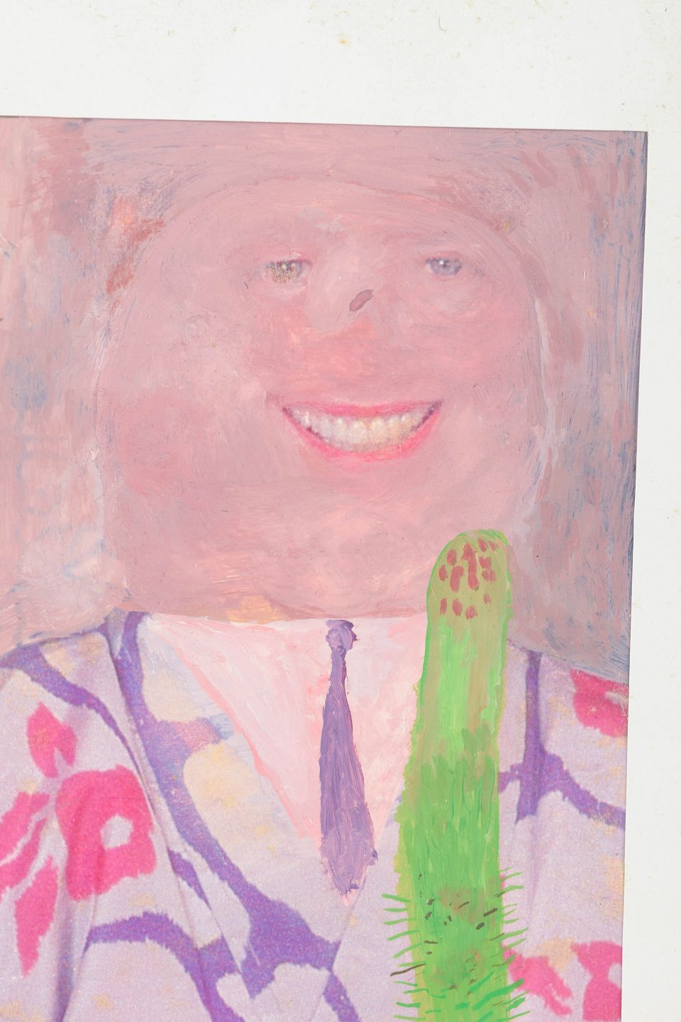 Naivistisk og humoristisk portræt af en smilende figur iført mønstret kimono og holdende en kaktus i potte. Let surrealistisk præg med dekorativ farvepalet i rosa, lilla og grønne toner.