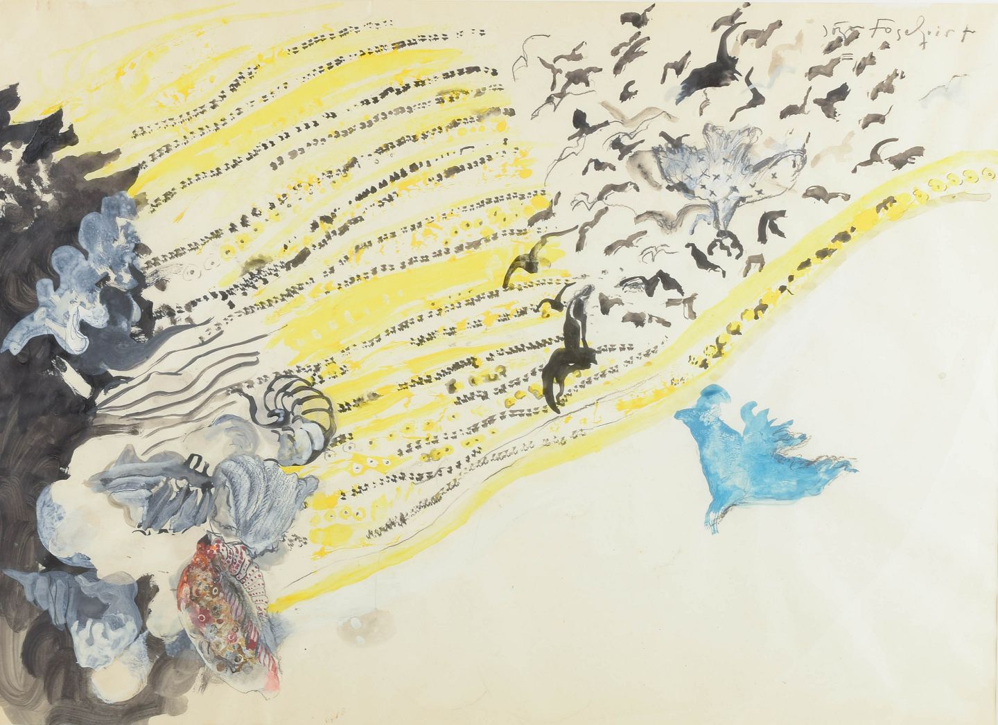 Et poetisk og bevægelsesfyldt akvarelmaleri, hvor musikalske gule rytmer bølger diagonalt gennem billedet og opløses i en sværm af flyvende fuglesilhuetter. Til venstre anes dybere, organiske formationer i blågrå toner, mens en lysere blå figurform svæver frit mod højre. Et værk med drømmende lethed og spirituel energi.