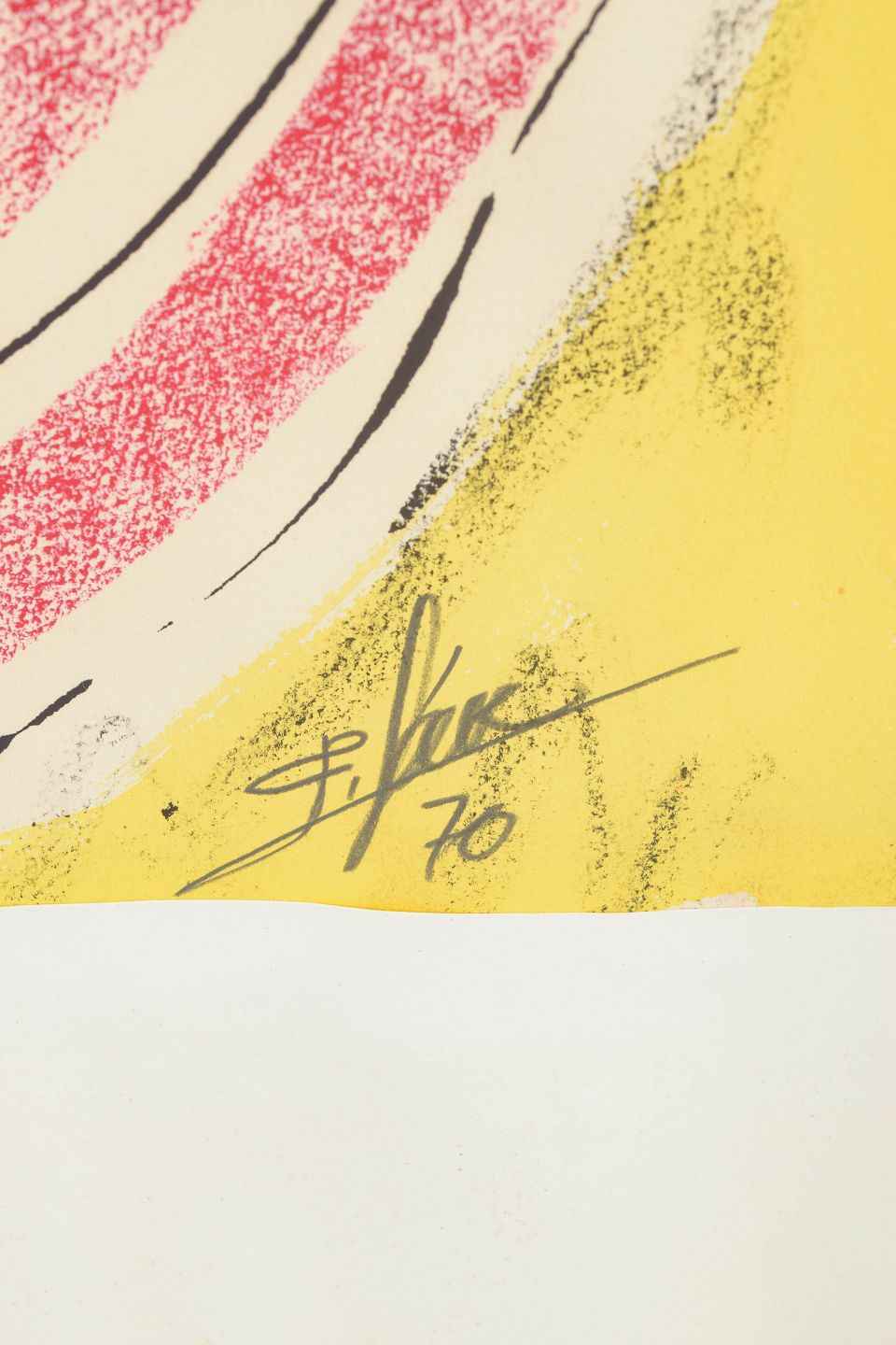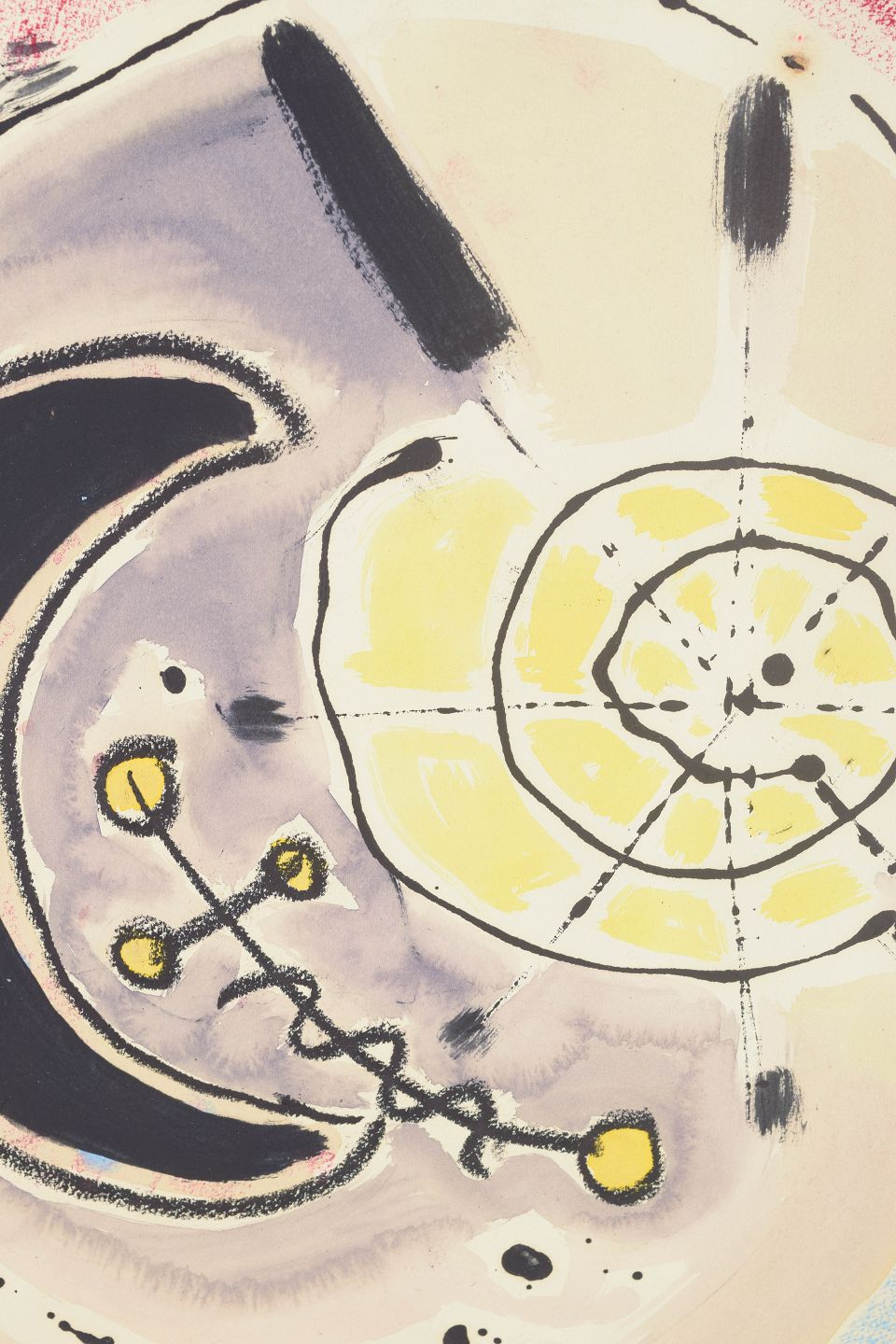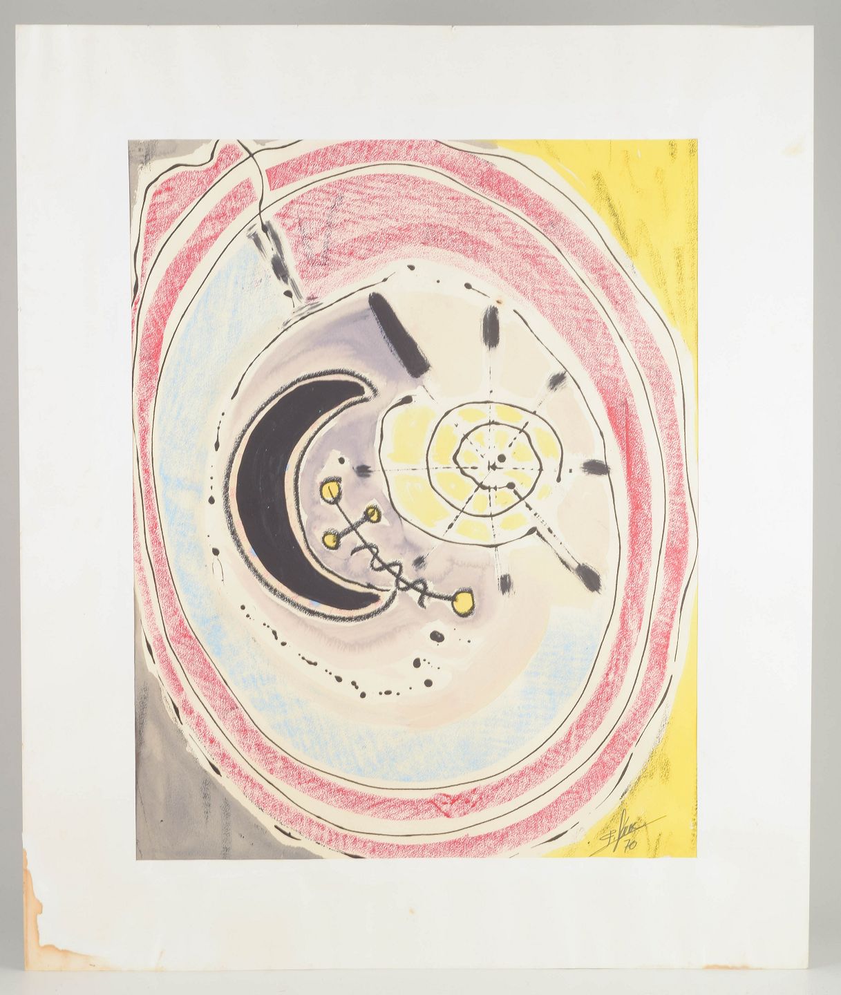 Et abstrakt og kosmisk motiv med organiske, spiralformede bevægelser i røde, gule og blå toner, centreret om et cirkulært felt med sol- og månelignende former. Kompositionen balancerer mellem det poetiske og det symbolske med grafiske rytmer og håndtegnet energi.