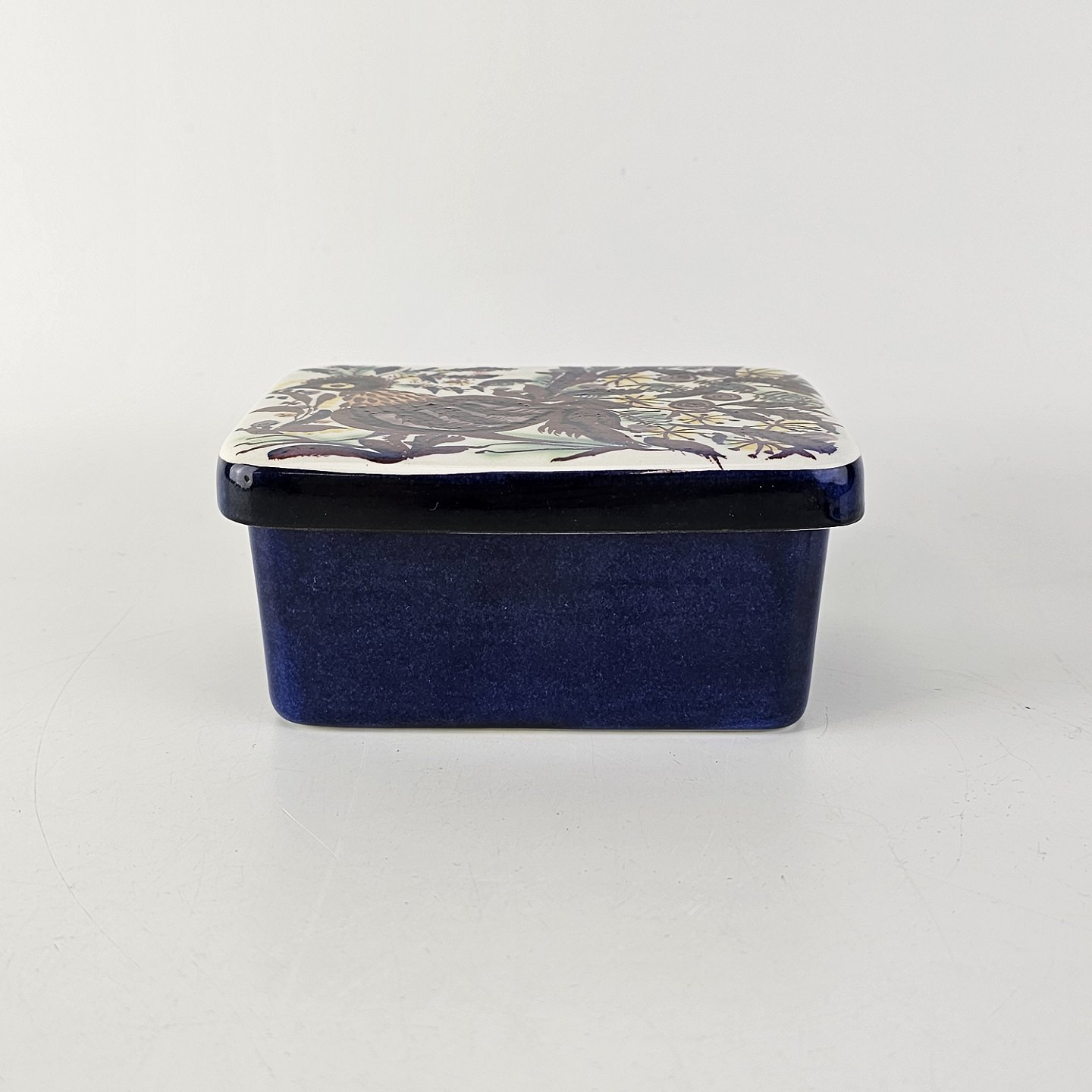 Smørboks fra serien Tenera. Boksen er i hvid fajance med blåmalet yderside og låget er dekoreret med motiv af en påfugl