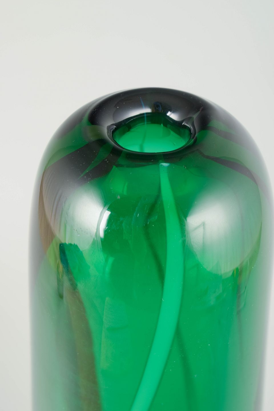 Mundblæst skandinavisk studioglas med tonegradueret farveskift fra blå til grøn. Stor skulpturel dobbeltbalusterform med slank hals.