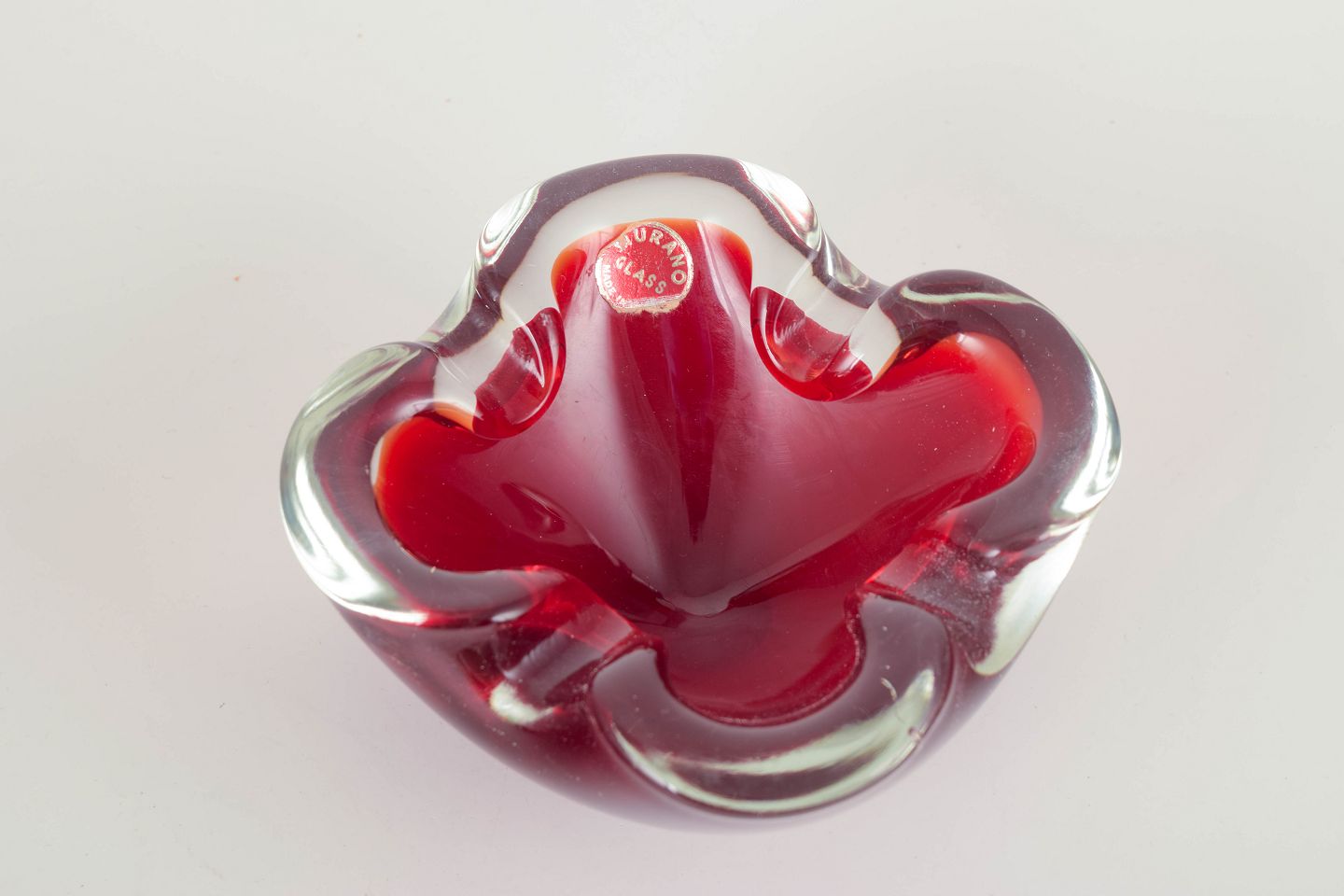 Organisk fritformet håndblæst skål i intens rubinrød sommerso-glas med blødt indfoldet rand og svævende klarhedsdybde — et klassisk eksempel på studioglas fra Murano.