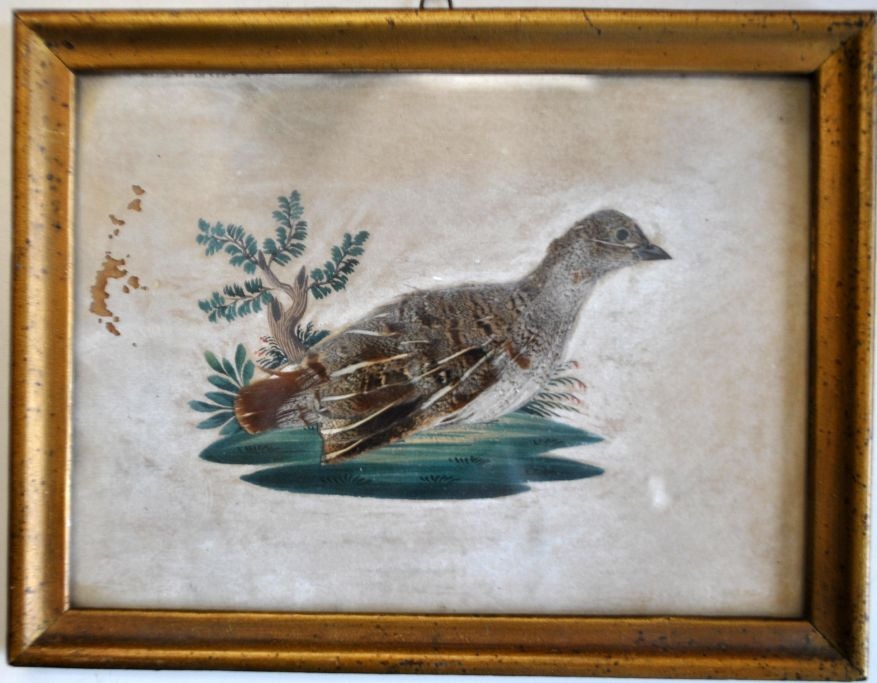 Kiebitz, Wilhelm (1847 - 1869) Danmark: En agerhøne. Fjerbillede på papir. Med akvarel. 13,5 x 18,5 cm.