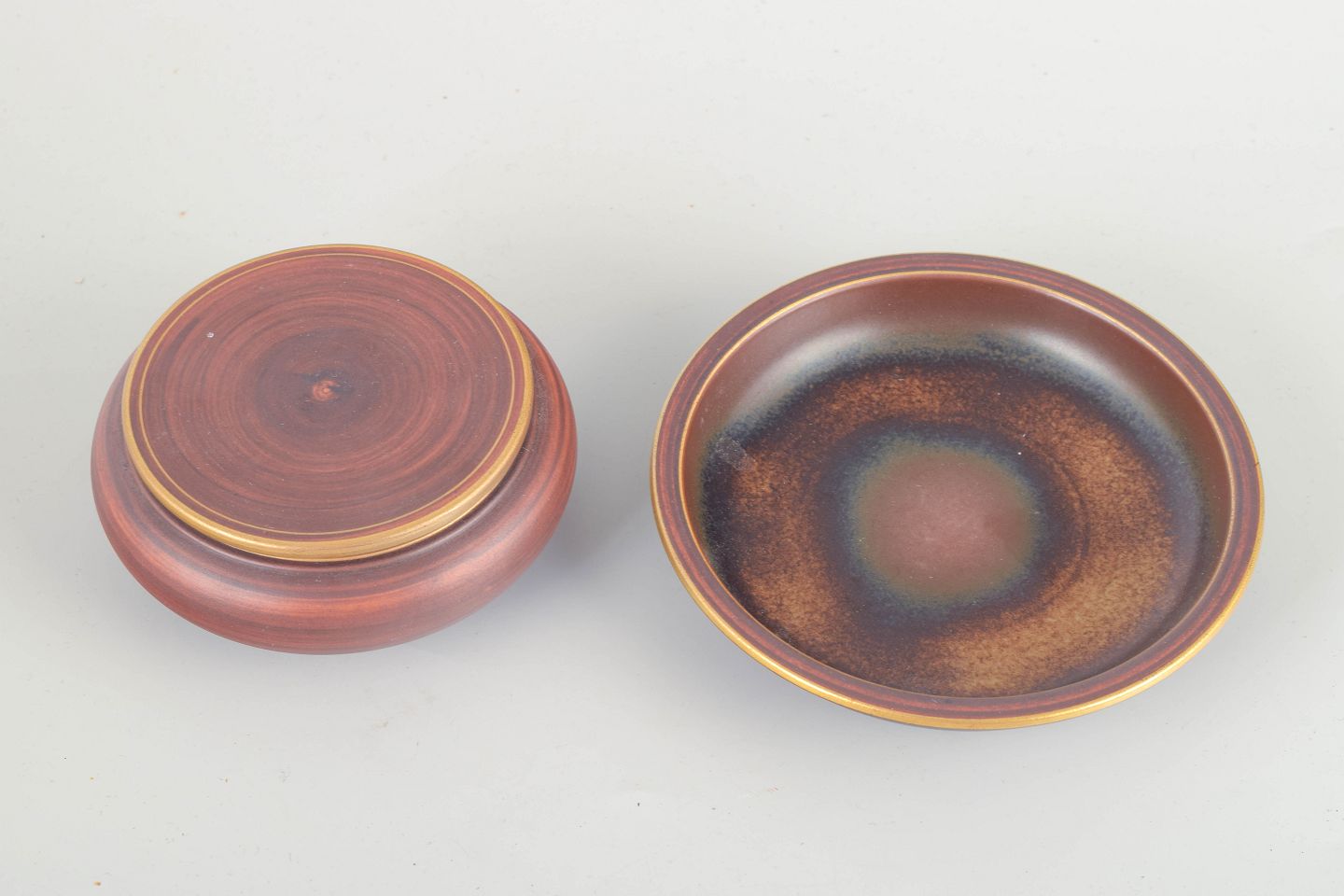 Hånddrejet keramiksæt bestående af en lågskål og et lavt fad, begge i varm brun/gylden glasur med subtile nuancer og elegant indrammet kantlinje.