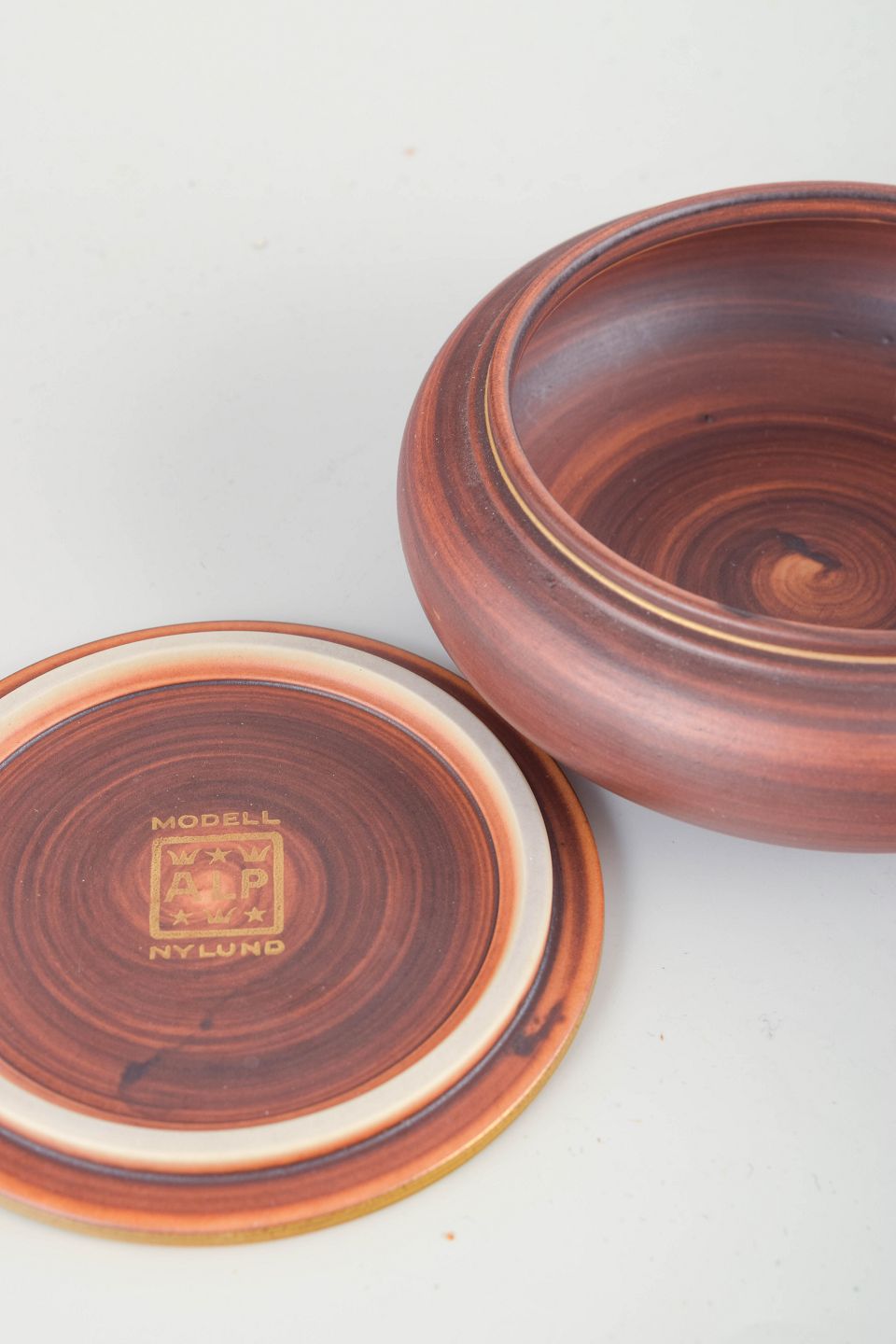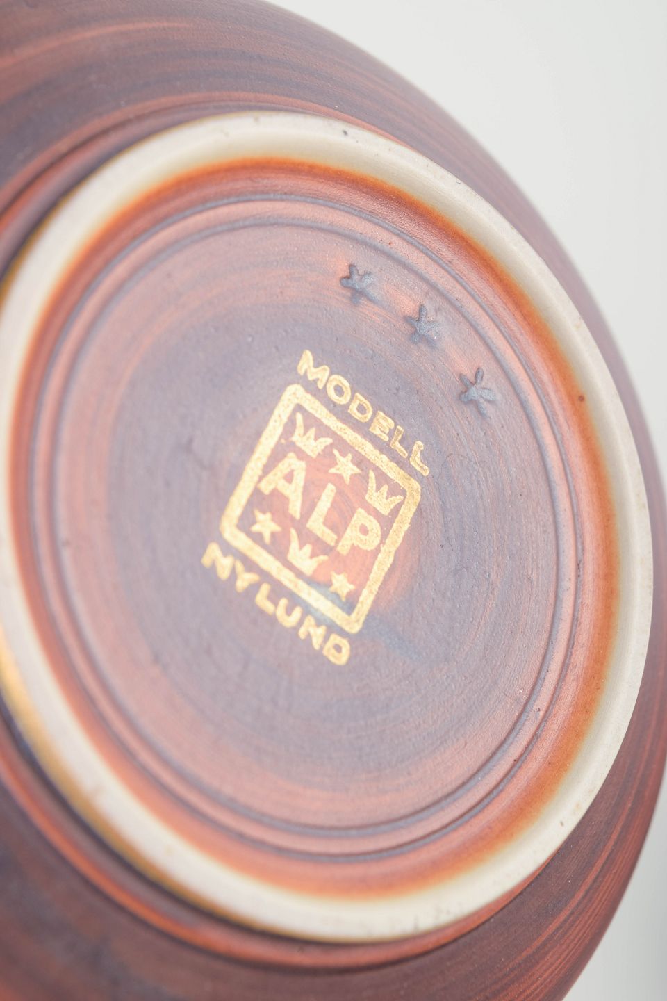 Gunnar Nylund (1904–1997) var en af Nordens mest betydningsfulde keramikdesignere, kendt for sine stilrene former og raffinerede glasurteknikker. Efter sin tid hos Rörstrand arbejdede han for flere svenske værksteder, herunder Alp i Lidköping, hvor han videreførte sin signatur i håndværksmæssig kvalitet og afdæmpet elegance.