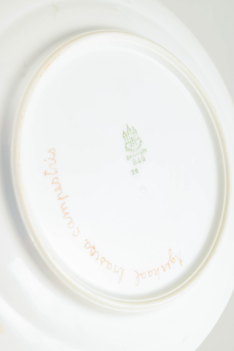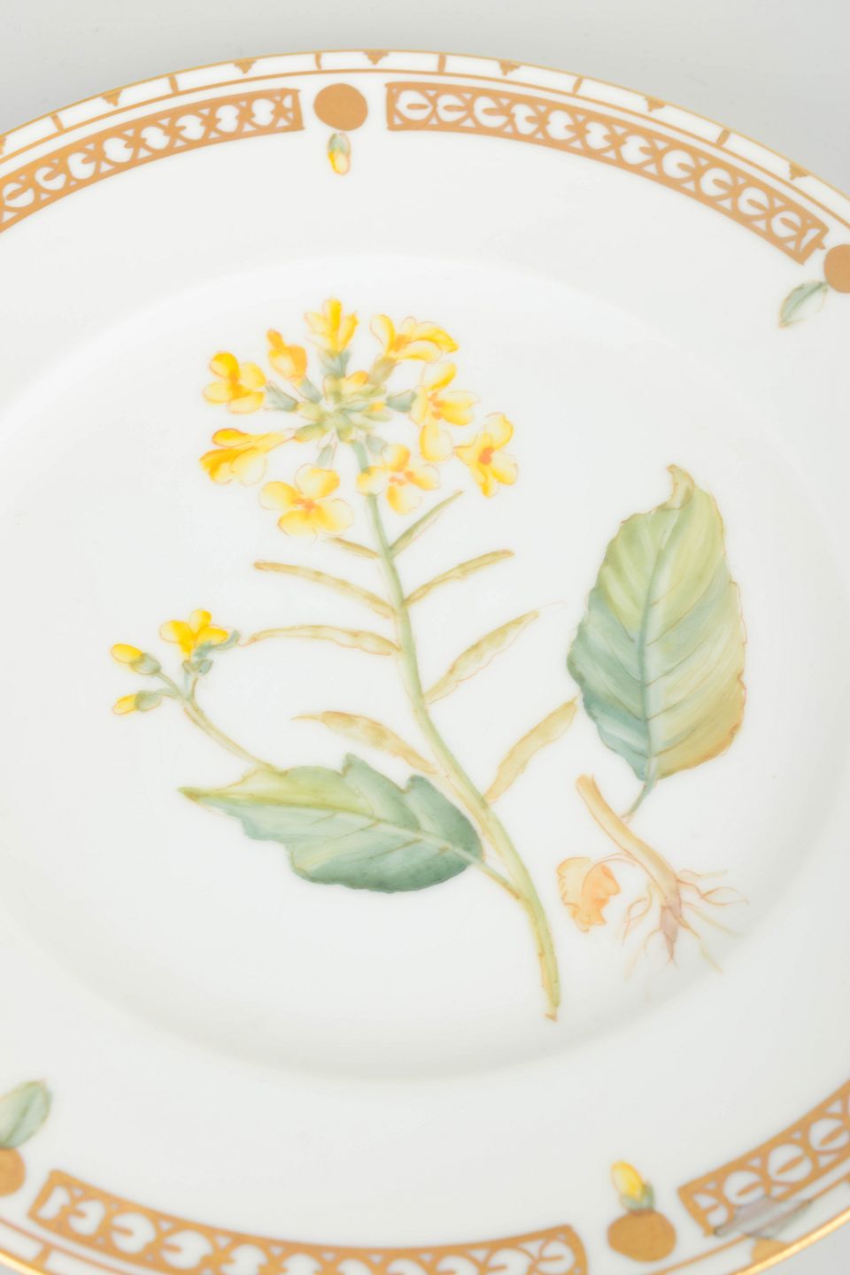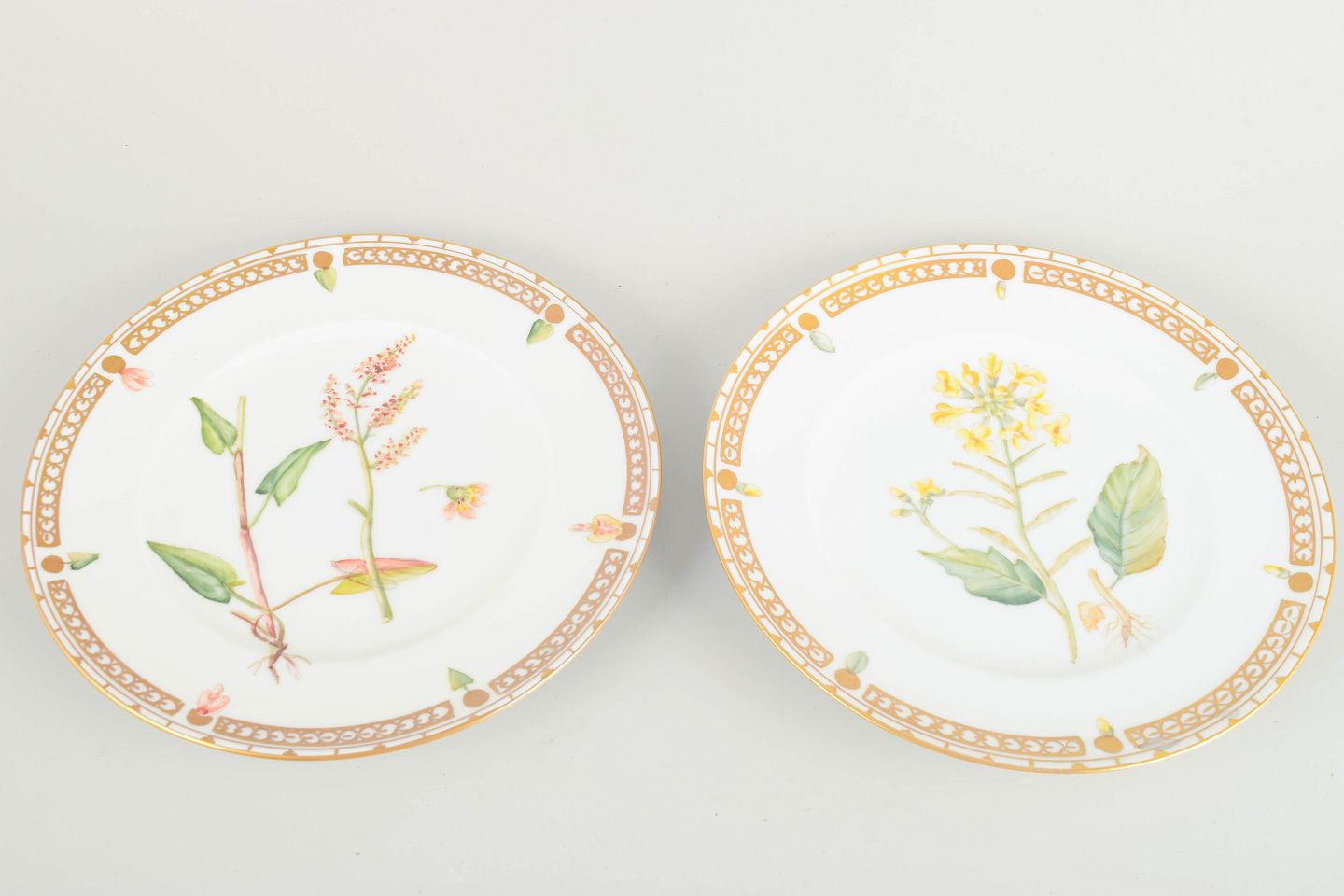 To porcelænstallerkener med håndmalede botaniske motiver og guldbemaling langs kanten. 2. sortering.