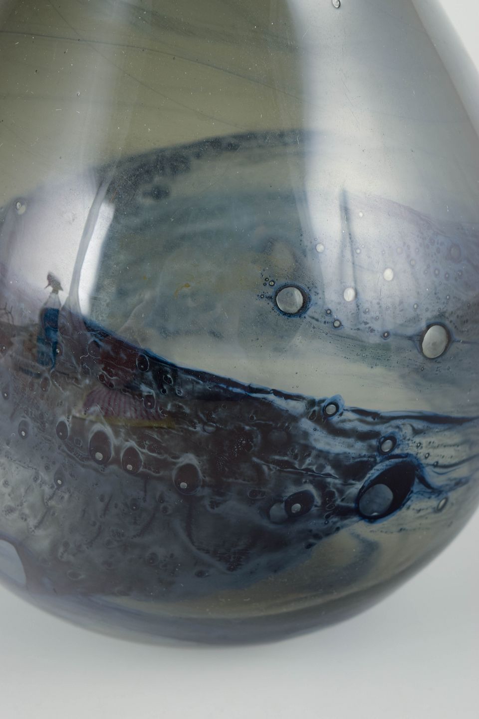 Skulpturel pæreformet vase i mundblæst glas med atmosfærisk, hav-/landskabslignende indre farvespil i blå-grå toner, typisk for Pukebergs eksperimenterende studioglas fra perioden.