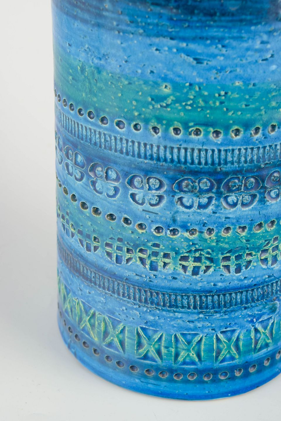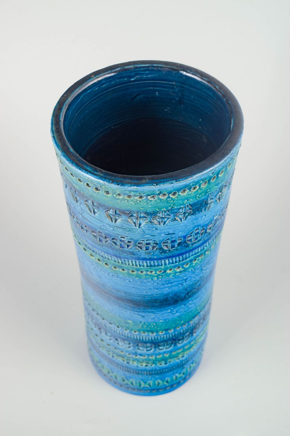 Imponerende høj vase i den ikoniske Rimini Blu-serie fra Bitossi, dekoreret med håndskårne geometriske mønstre og dyb, turkis-blå glasur med grønne nuancer.