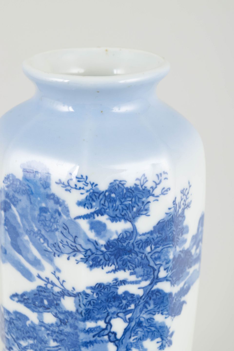 Elegant, håndmalet porcelæns­vase i lyseblå glasur med dekoration af blå træer i klassisk kinesisk stil. Fin, slank form med smal hals og blød overgang til korpus.