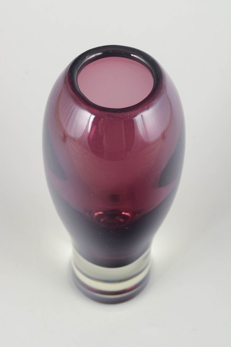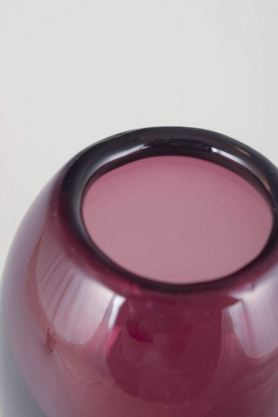 Elegant finsk kunstglasvase i klart og blåt glas med blødt afrundet form og karakteristisk nordisk enkelhed. Et klassisk eksempel på Okkolins design for Riihimäen Lasi i 1960’erne, kendt for sine rene linjer og poetiske lysspil.