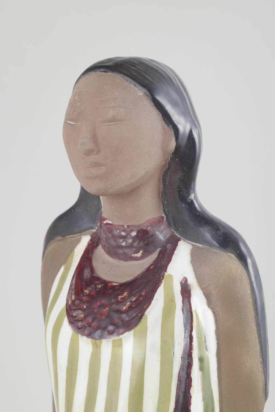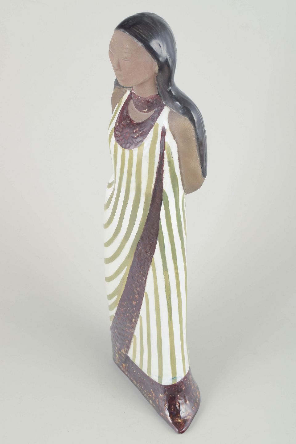 Stor håndmalet keramikfigur af en kvinde med langt hår, iført hvid kjole med grønne diagonale striber og brun dekorationskant med tekstur. Et elegant og roligt arbejde af Mari Simmulson, kendetegnet ved hendes karakteristiske stiliserede form og varme farvepalet.