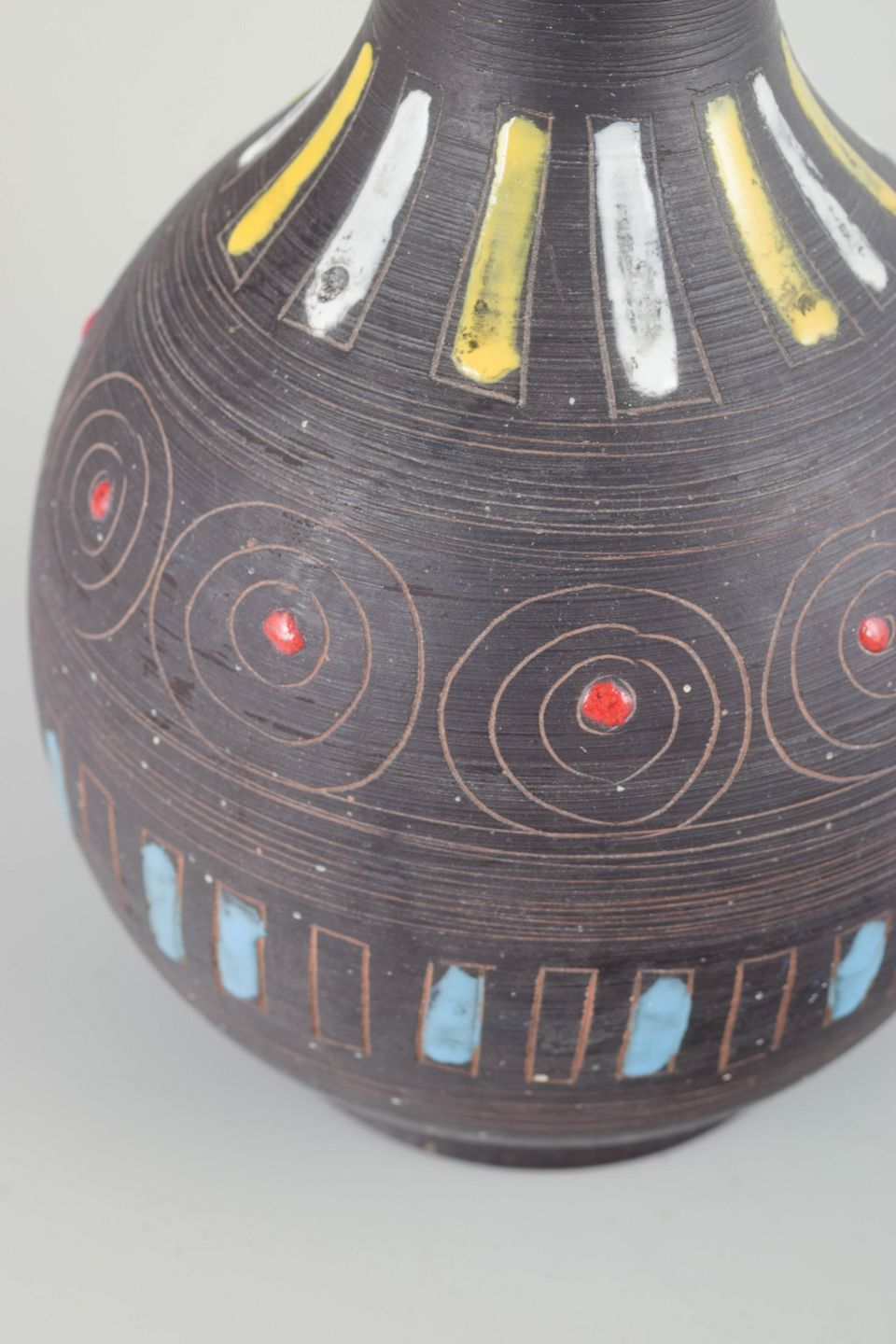 Håndmalet keramisk vase med slank hals og dekorativt geometrisk mønster i sort, blå, gul og rød. Et karakteristisk eksempel på italiensk studiokeramik fra 1960’erne med livlige farver og grafisk udtryk.