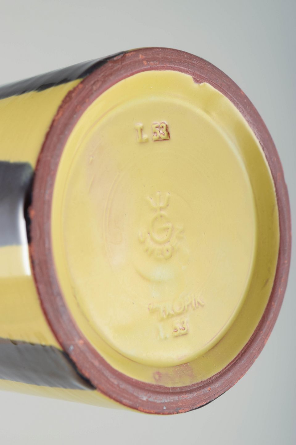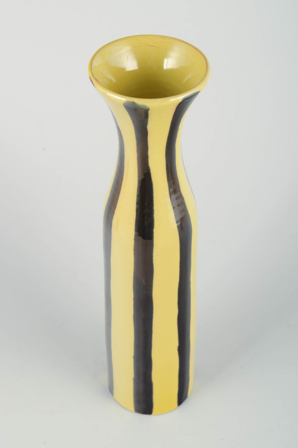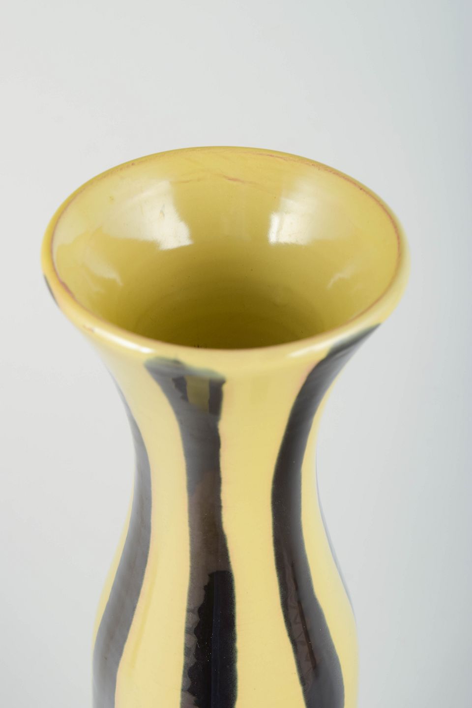 Høj, slank vase med håndmalede lodrette striber i gul og sort — et klassisk eksempel på Gefles farverige og grafiske design fra perioden.