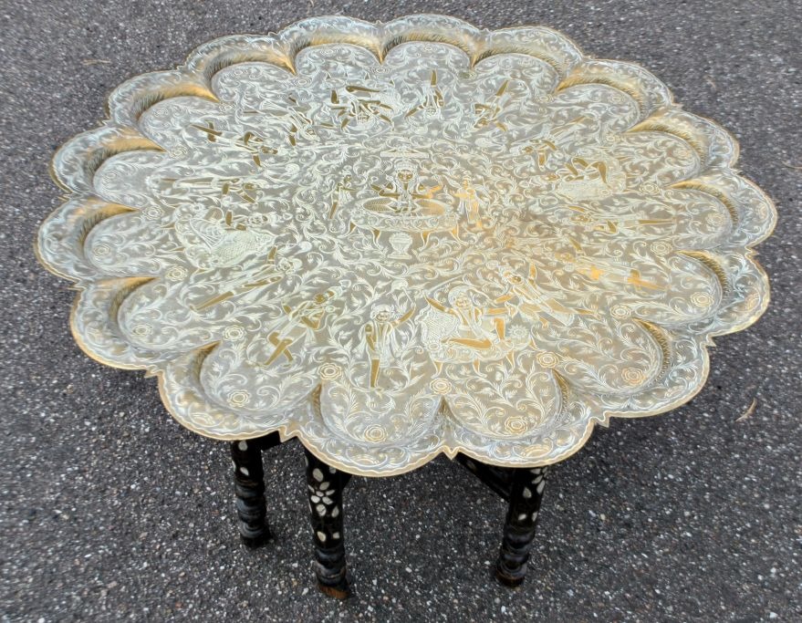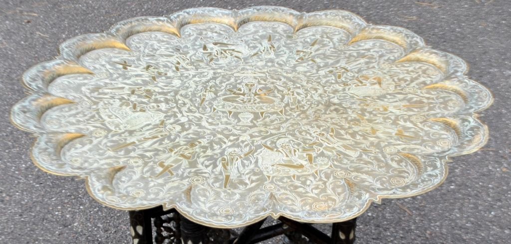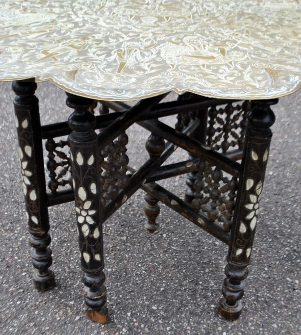 Arabisk rygebord med messingplade fra Indien, 19./20. årh. Messsingplade dekoreret med Guder. Understel i træ med indlagt perlemor. H.: 47,5 cm. Dia.: 77,5 cm.