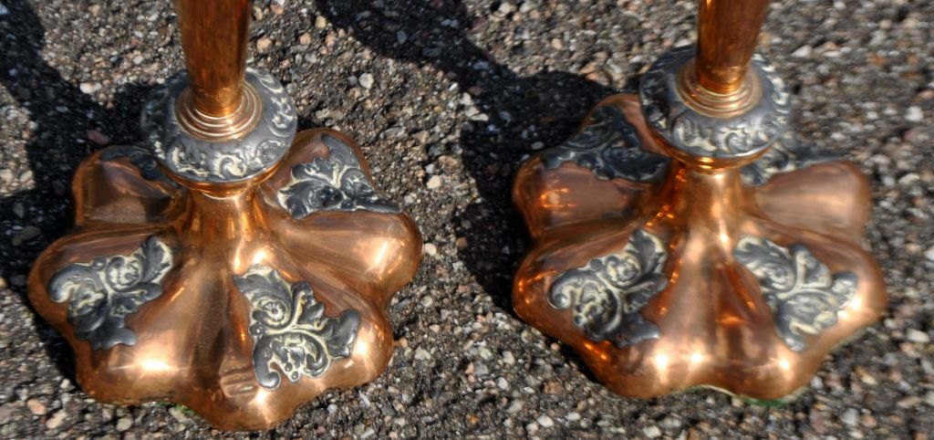 Et par engelske kobberstager med tin, 19. årh. H.: 30,5cm.