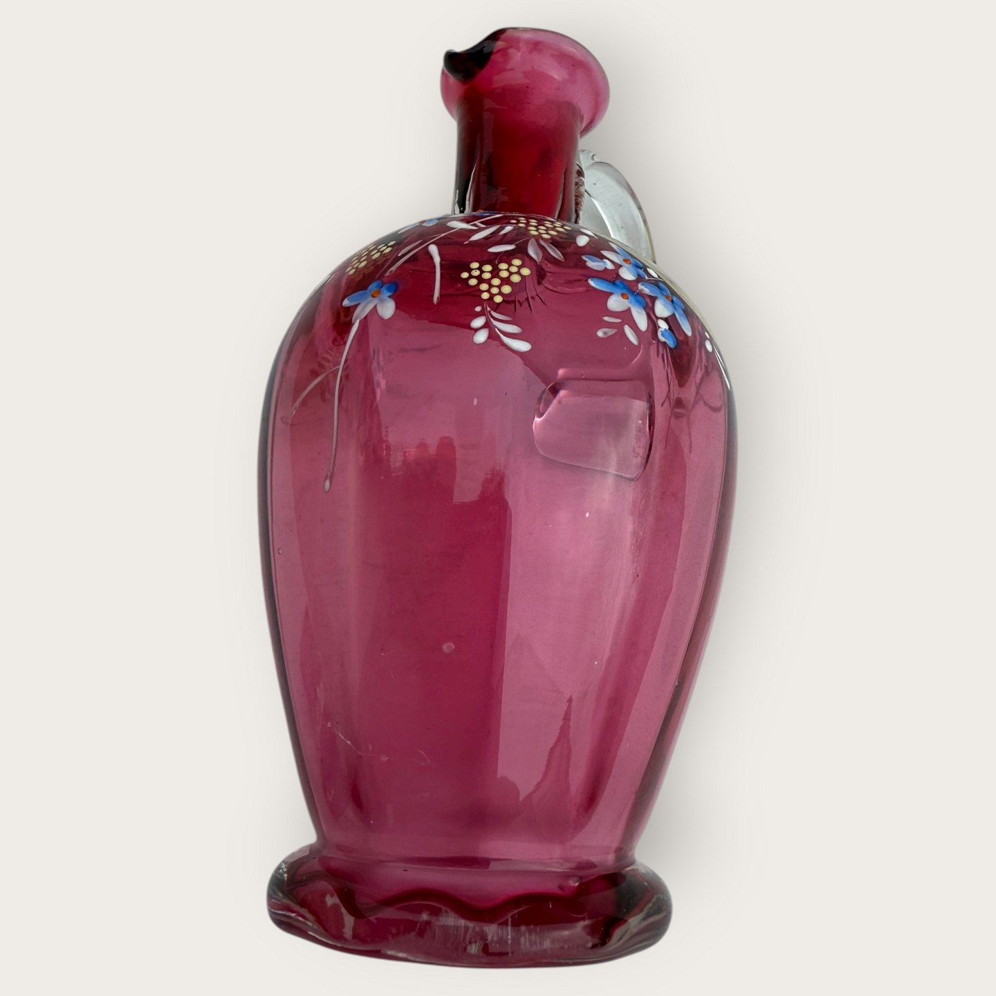 Ældre midteuropæisk karaffel i pinkfarvet glas med bemaling, medfølgende 2 glas, Karaffel ca. 21cm høj og 9cm bred, de to glas har meget små nøk i kanten, karaflen er i fin stand.